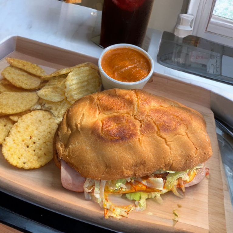 DELICIOSO BAGUETTE DE PAN CALIENTE DE QUESO PARMESANO CON JAMON DE PAVO PREMIUM, MAYONESA, LECHUGA, TOMATE, AGUACATE Y QUESO AMARILLO. ACOMPAÑADO DE PAPAS FRITAS Y JALAPEÑOS