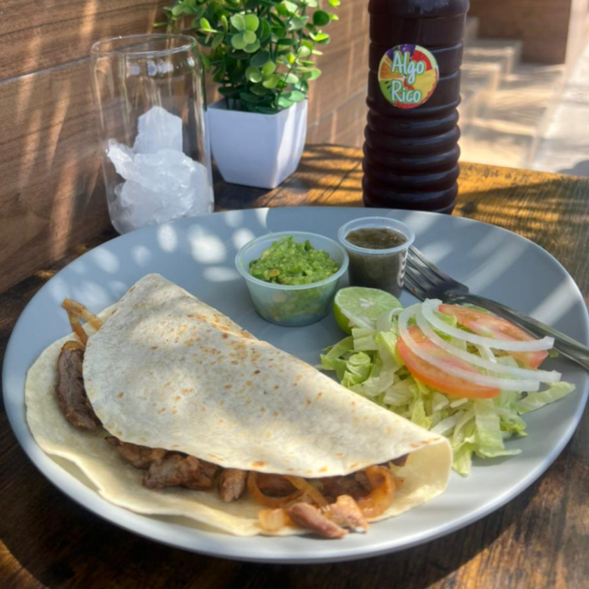 TORTILLA DE HARINA CON QUESO MONTERREY, COCHINITA PIBIL, CEBOLLA MORADA, ENSALADA, ACOMPAÑADO DE SALSA, GUACAMOLE, LIMON,
