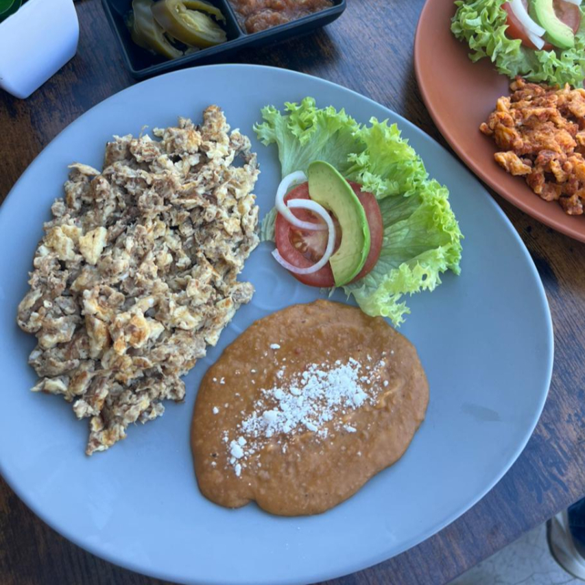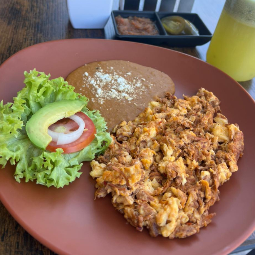 DOS PIEZAS DE HUEVO, MACHACA DE RES, FRIJOL, QUESO, ACOMPAÑADO DE ENSALADA, TORTILLAS Y SALSA.