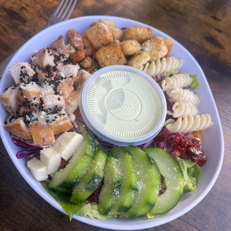 MIX DE LECHUGAS FRESCAS, PEPINO, ZANAHORIA RALLADA, COL MORADA, QUESO PANELA, 80 GRAMOS DE PROTEÍNA, PASTA, AJONJOLI, ARANDANOS, CACAHUATE GARAPIÑADO, QUESO PARMESANO, ACEITE DE UVA, ADEREZO DE CILANTRO