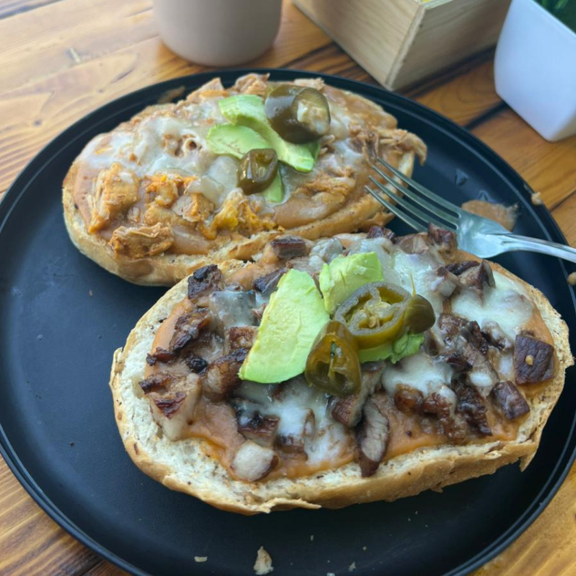 DOS PIEZAS DE TELERA CON FRIJOL, CARNE DE RES SIRLOIN, QUESO MONTERREY, AGUACATE, ACOMPAÑADO DE JALAPEÑOS.