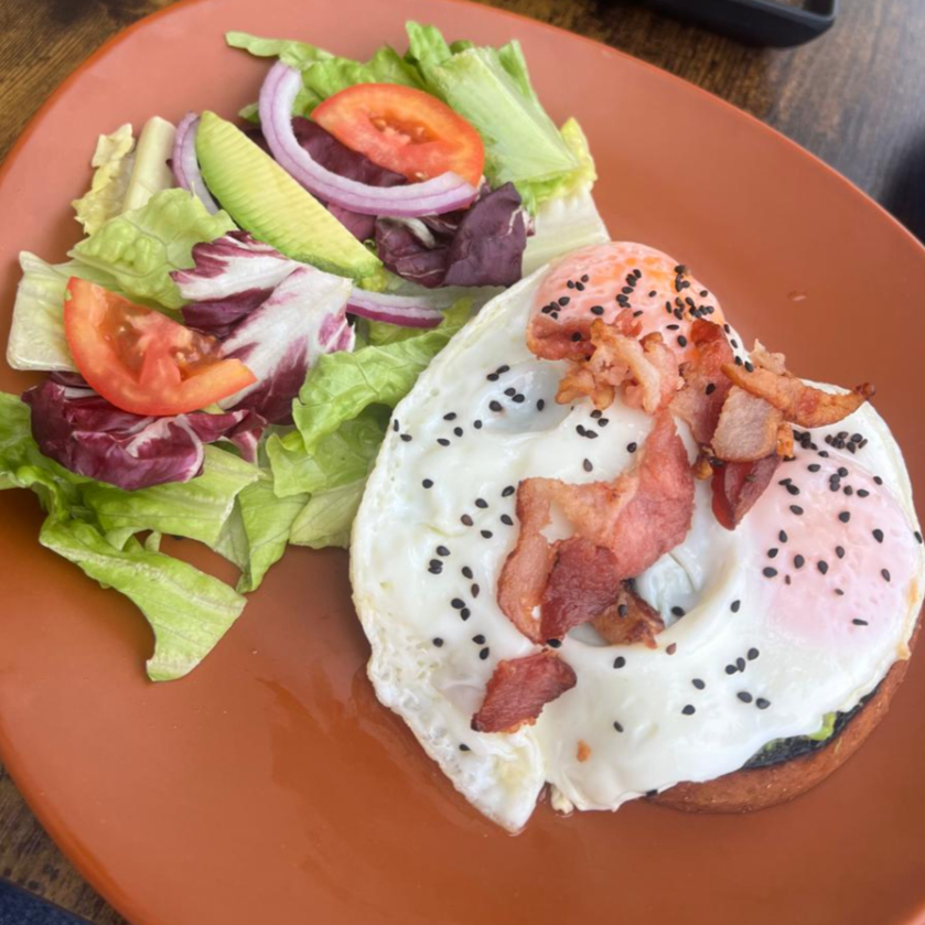 Pieza integral gruesa, guacamole, tocino frito, dos piezas de huevo al gusto, ajonjoli negro, ensalada de acompañamiento bañada con aderezo de cilantro.