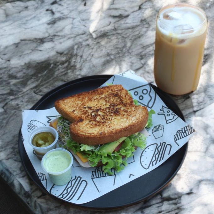 SANDWICH DORADO CALIENTE CON PAN INTEGRAL GRUESO, PREPARADO CON PECHUGA DE POLLO, MAYONESA , LECHUGA ITALIANA, TOMATE, AGUACATE, ACOMPAÑADO DE ADEREZO DE CILANTRO, PAPAS FRITAS Y JALAPEÑOS.