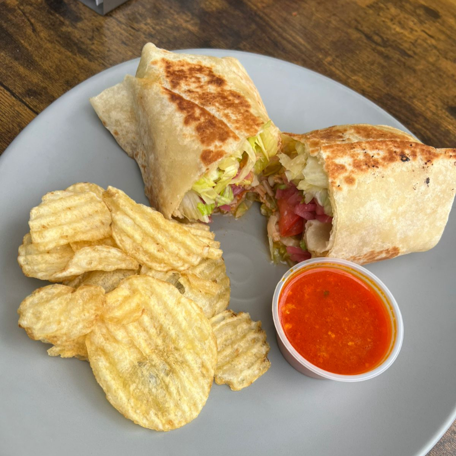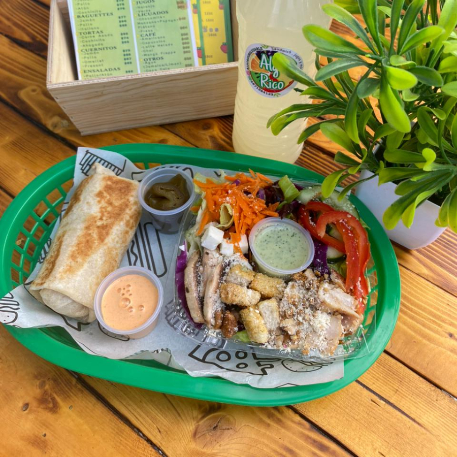 BURRITO DE POLLO CON PHILADELPHIA, QUESO AMERICANO, CHAMPIÑONES , LECHUGA. ACOMPAÑADO DE MEDIA ENSALADA CON POLLO Y VEGETALES FRESCOS. ACOMPAÑADO DE ADEREZO DE CILANTRO, PAPAS FRITAS Y UN AGUA DE SABOR