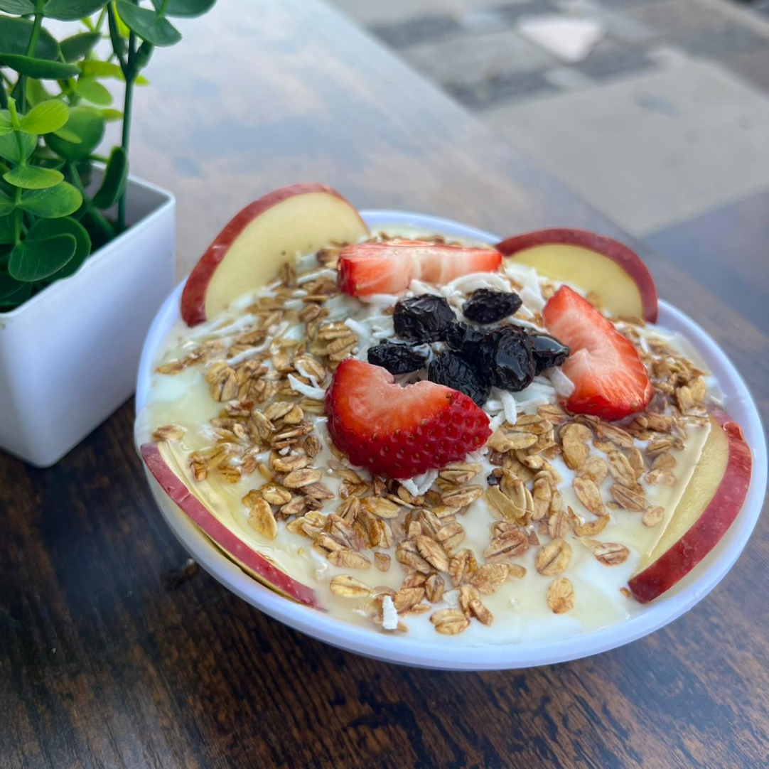 CHAROLA DE FRUTA PICADA (MANZANA, PLÁTANO, PAPAYA, PERA, KIWI) GRANOLA, COCO, PASAS, MIEL, YOGURTH NATURAL