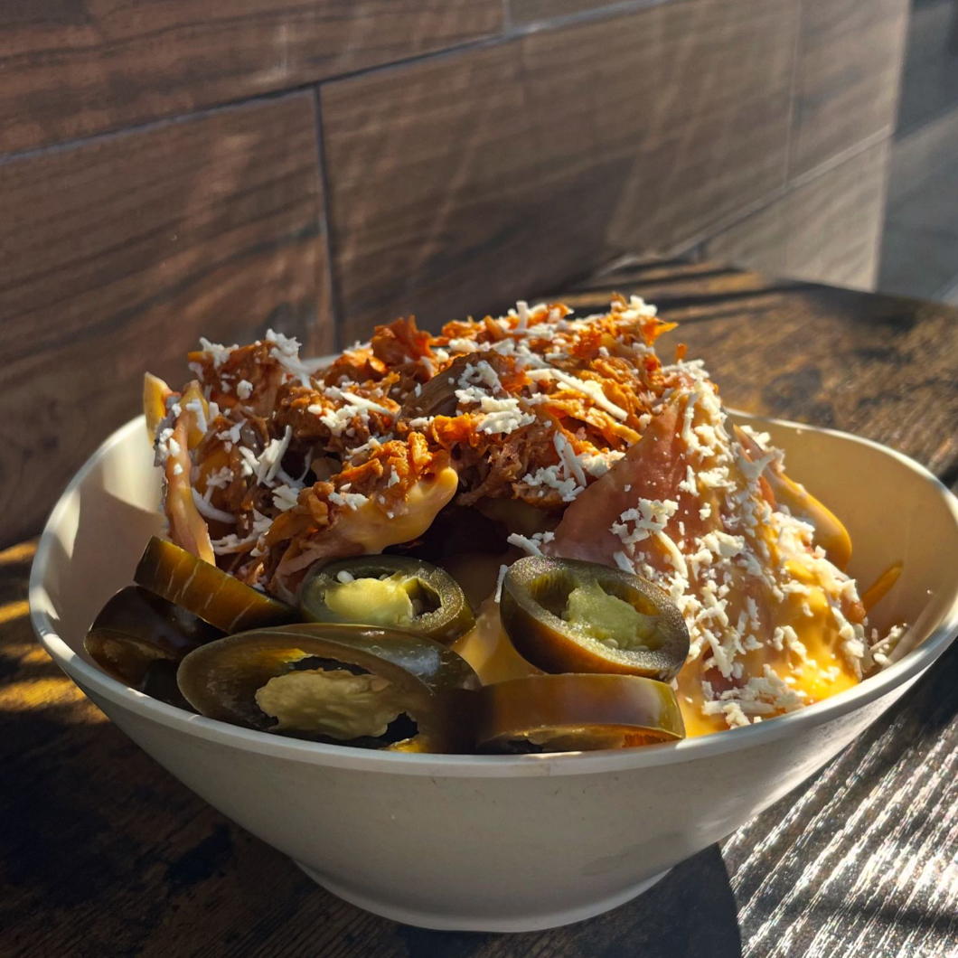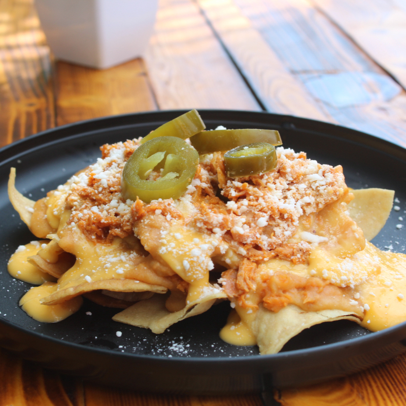 CRUJIENTES TOTOPOS CON FRIJOL PUERCO, QUESO CHEDDAR PARA NACHOS, COCHINITA PIBIL,QUESO COTIJA, ACOMPAÑADO DE JALAPEÑOS.