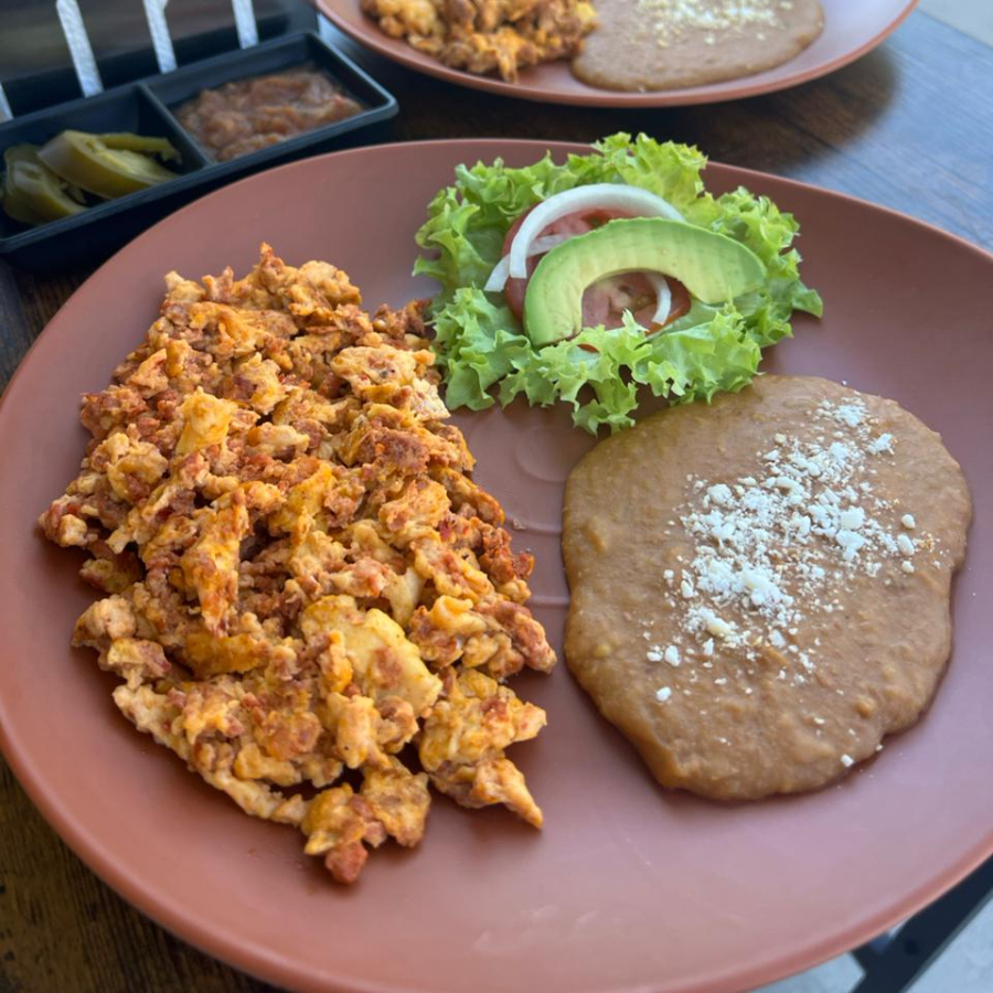 DOS PIEZAS DE HUEVO, CHILORIO DE RANCHO, FRIJOLES, ACOMPAÑADA DE ENSALADA, TORTILLAS Y SALSA.