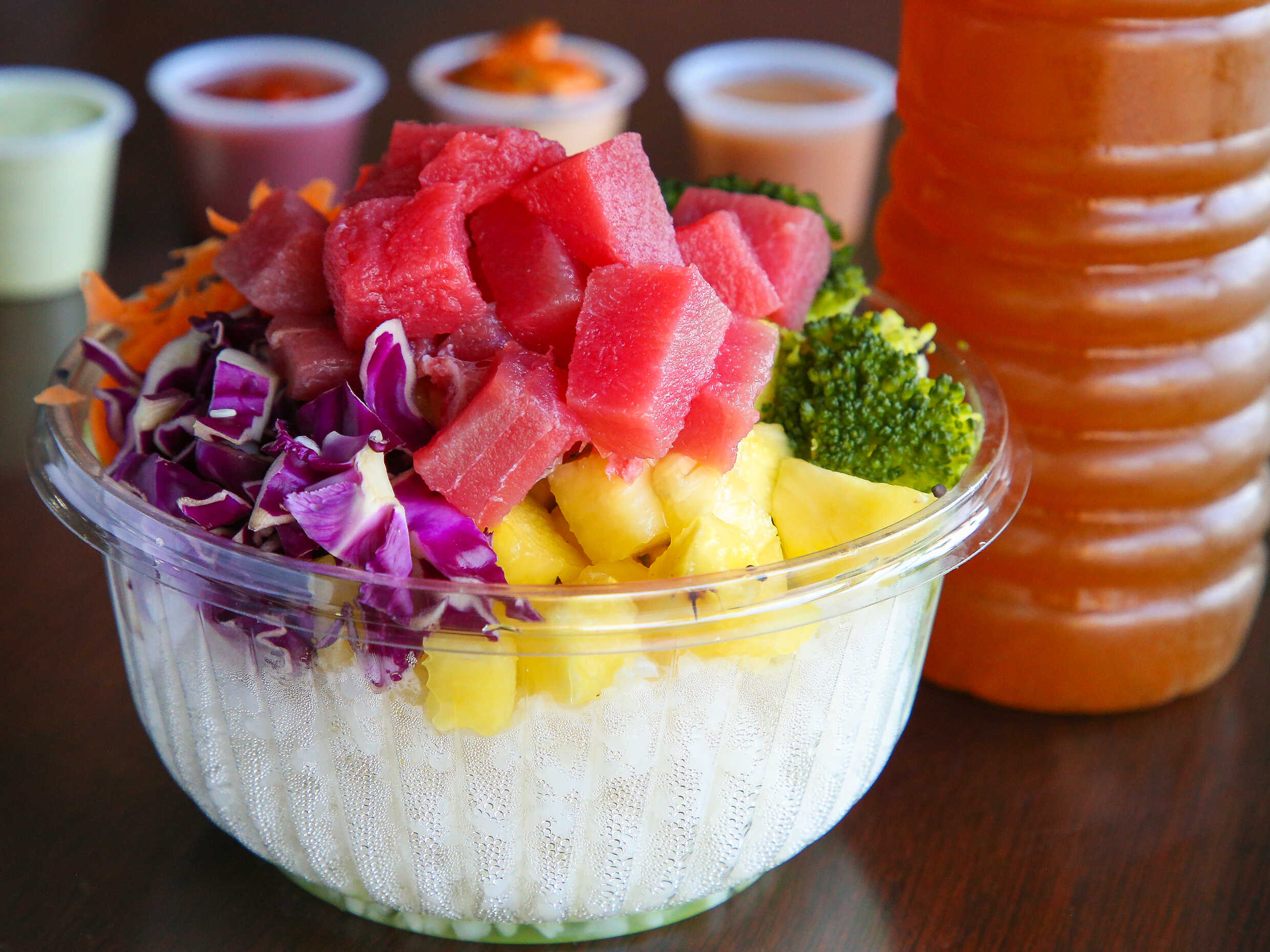 Base, dos proteinas, vegetales y aderezo.