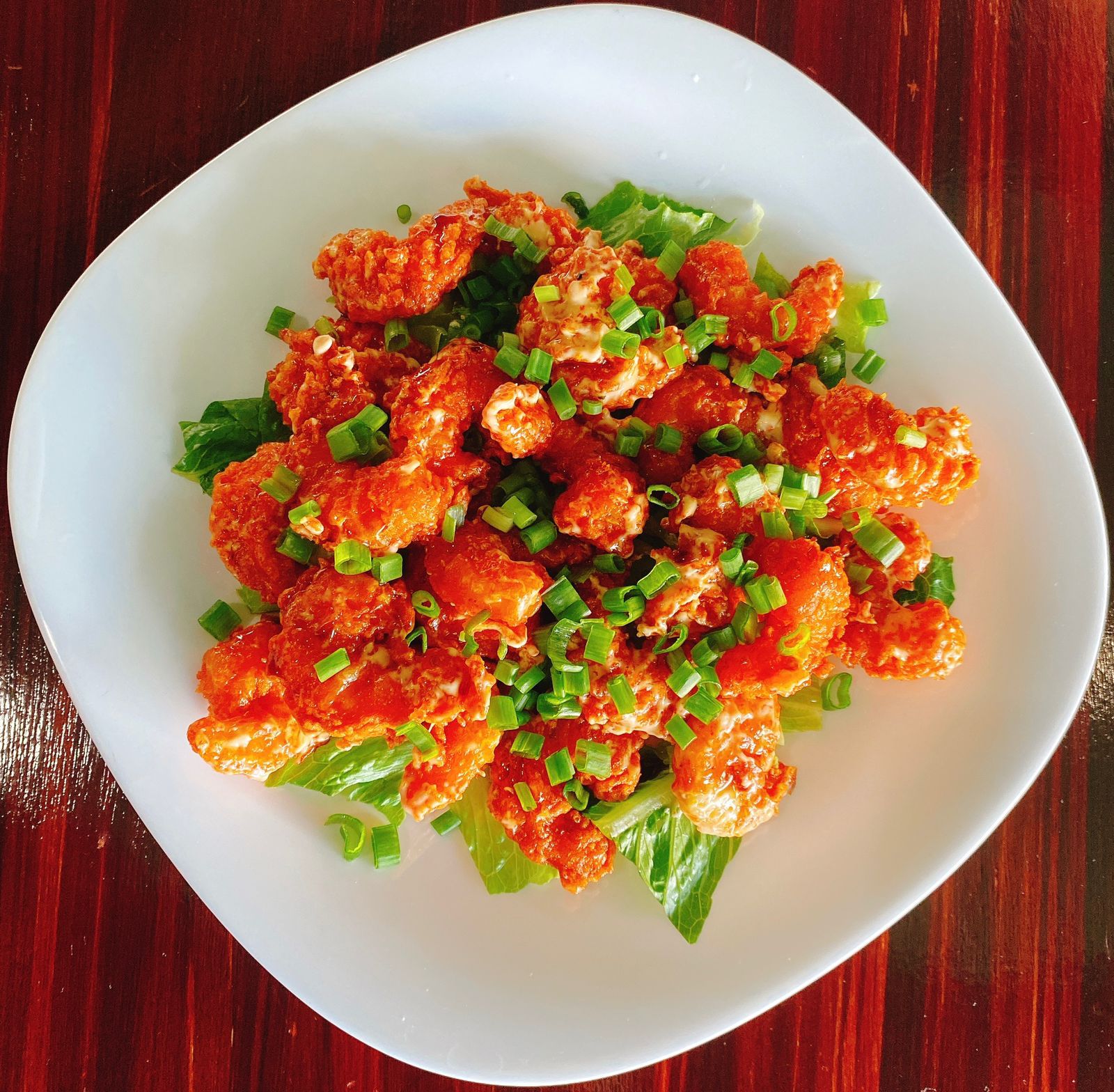 Camarones roca 240 gr. Servidos en cama de lechuga bañados en aderezo spacy servidos con un toque de anguila cebollín encima