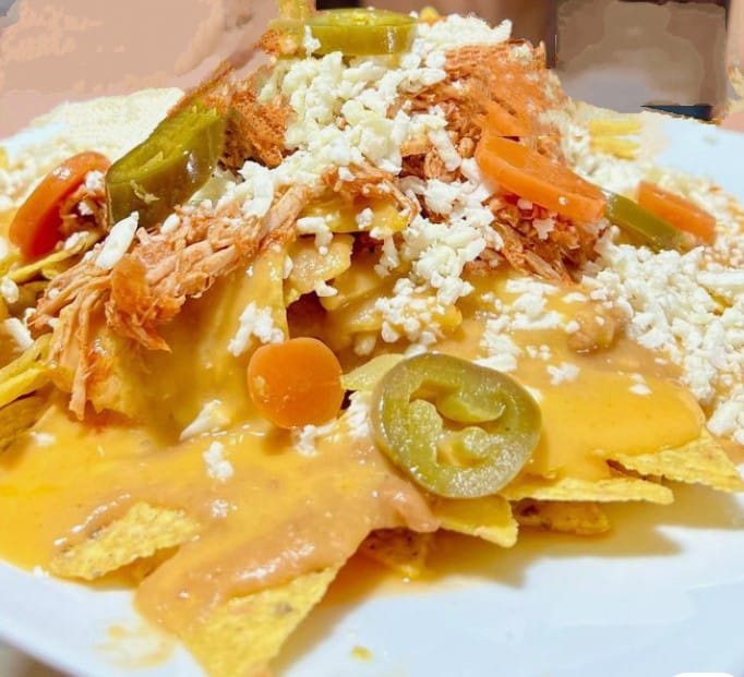 Totopos bañados de frijol, salsa, cochinita, queso y jalapeños.