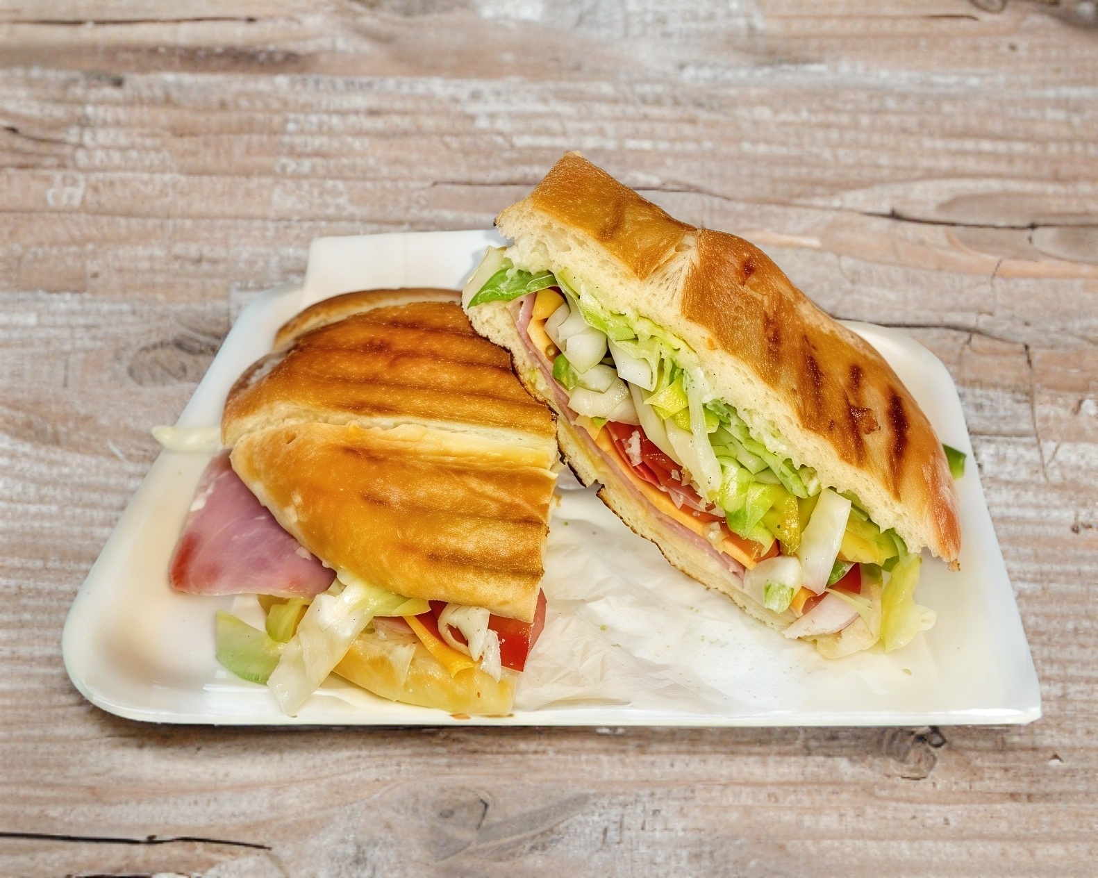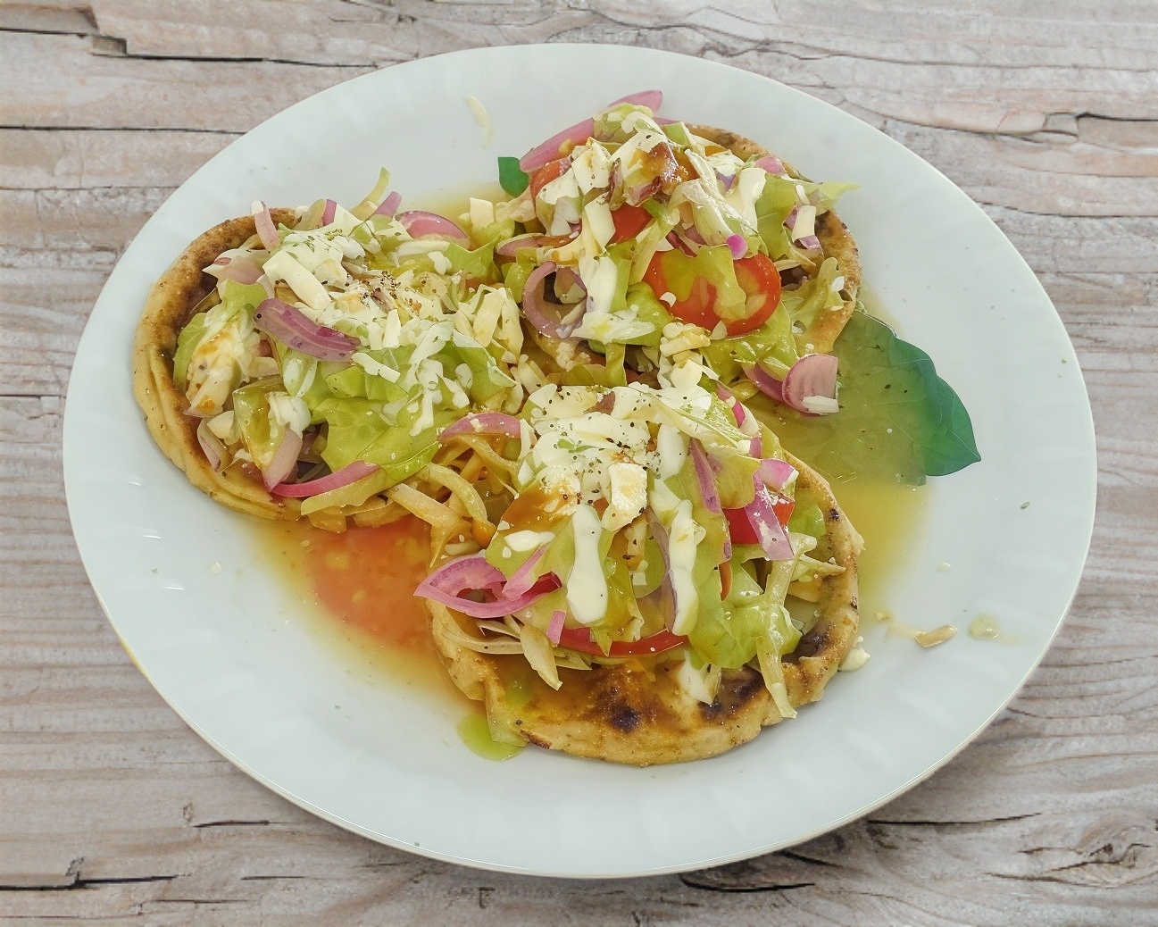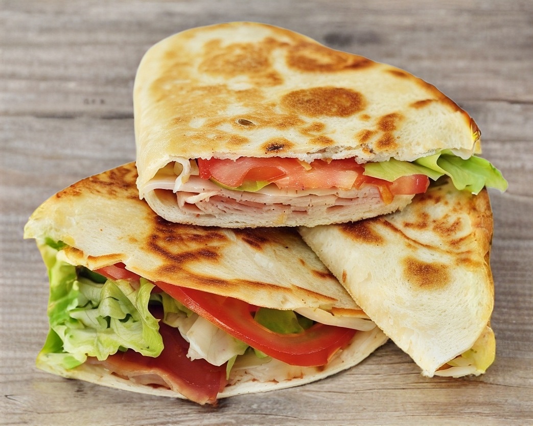 Quesadilla de harina con jamón, verdura y aderezo.