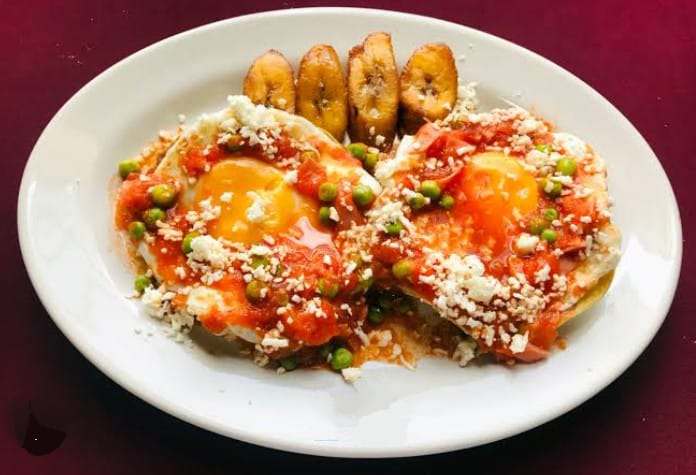 Servidos sobre una tortilla con frijol.y bañados de salsa roja y queso.con plátano frito.
