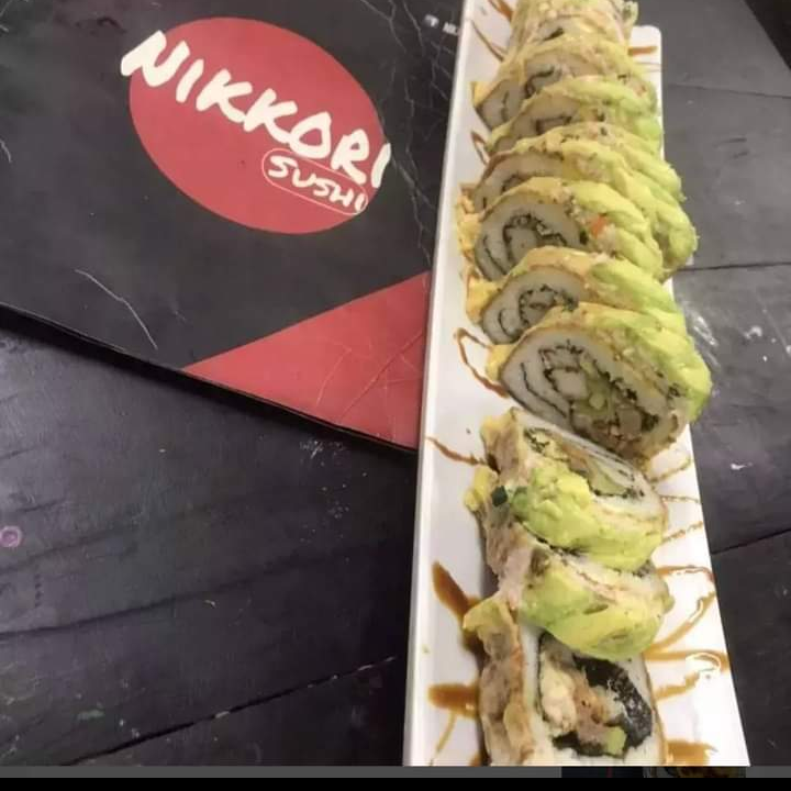 Ingrediente a elegir por dentro,forrado de aguacate bañado en salsa de anguila,Tampico a un lado
