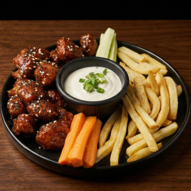 🍗🔥 200 g de jugoso pollo empanizado bañado en salsa Buffalo o BBQ (tú eliges). 🍟🥒🥕 Acompañado con papas, bastones de pepino y zanahoria, y aderezo ranch para el toque final. 👉 Perfectos para compartir... o no.