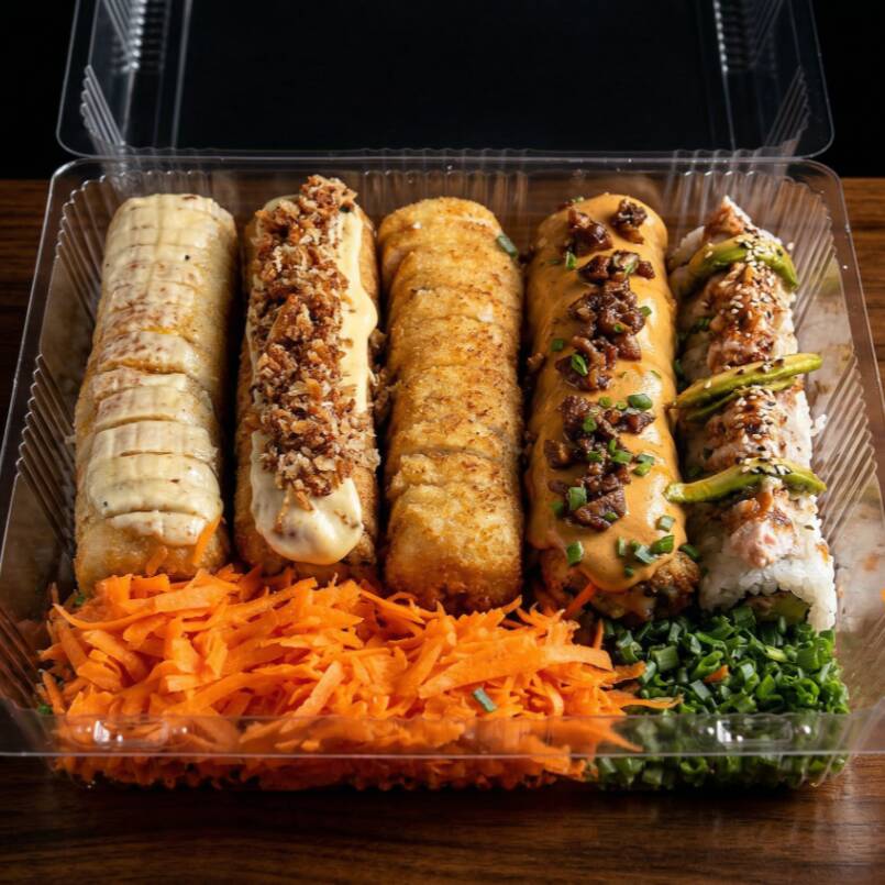 🍣 5 rollos base + porción de tampico, ideal pa’ compartir: 🦀Rollo base natural de surimi 🍗Rollo base empanizado de pollo 🥩Rollo base empanizado de res 🥓Rollo base empanizado de tocino 🦐Rollo base natural de camaron