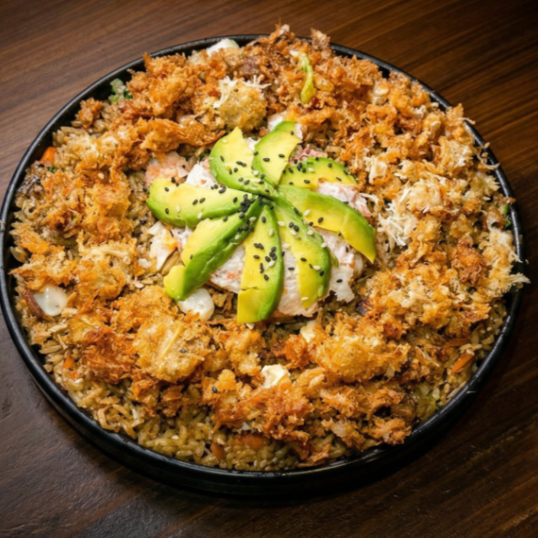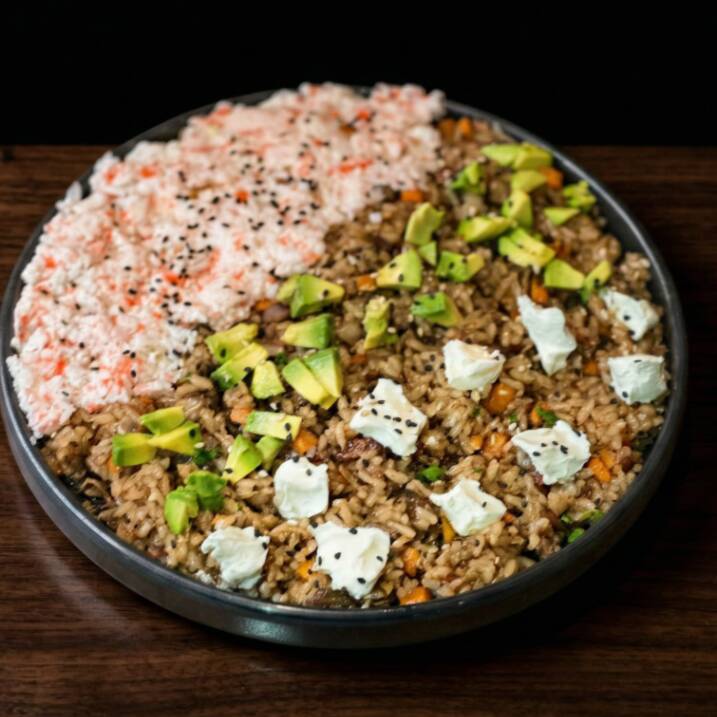 "🍚🥩🦐🥓 Arroz frito con res, camarón, tocino y cebollín. 🥑Acompañado de queso Philadelphia, tampico y láminas de aguacate. 🍗Coronado con crujiente pollo frito que le da el toque final irresistible. 👉 Un plato completo, cargado de sabor y puro estilo AROLL."