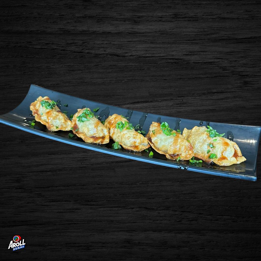 "🥟🔥5 Crujientes gyozas rellenas, doraditas al punto perfecto, bañadas con salsa de anguila spicy que les da el toque picosito y adictivo. ✨ Un snack ideal pa’ empezar con todo o acompañar tu rollo favorito."