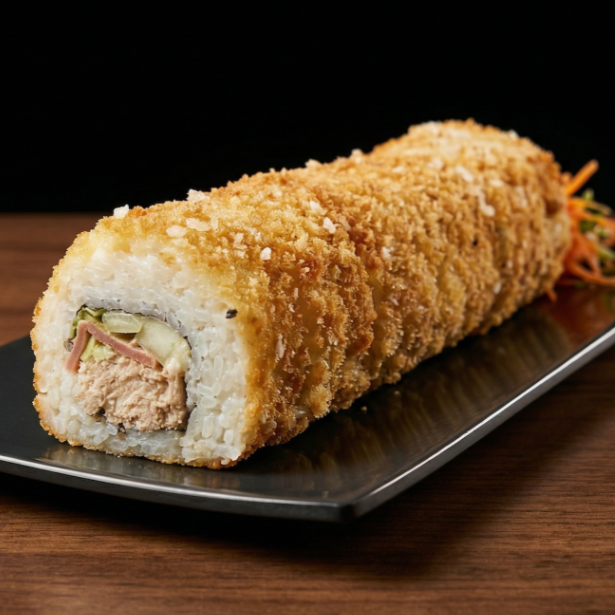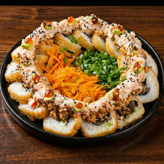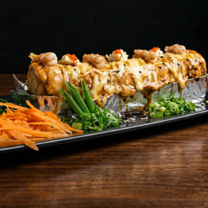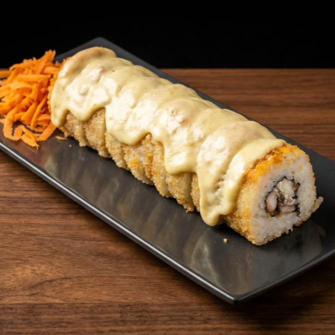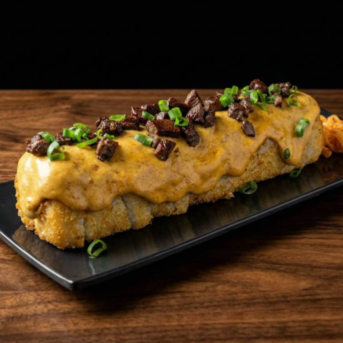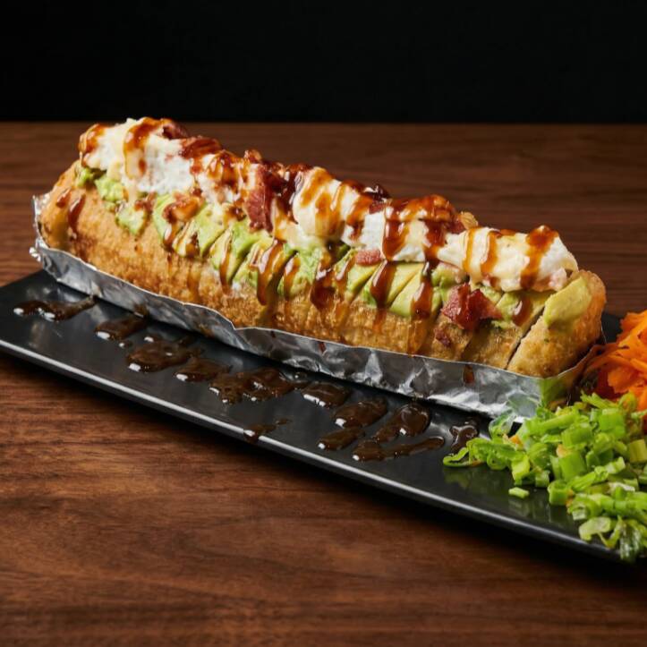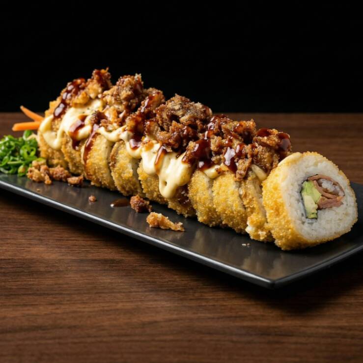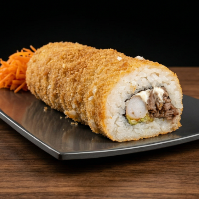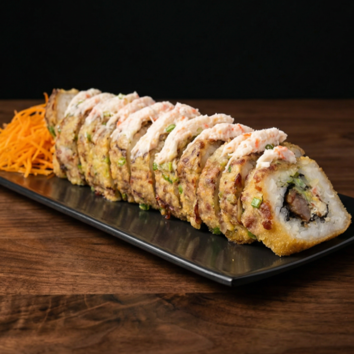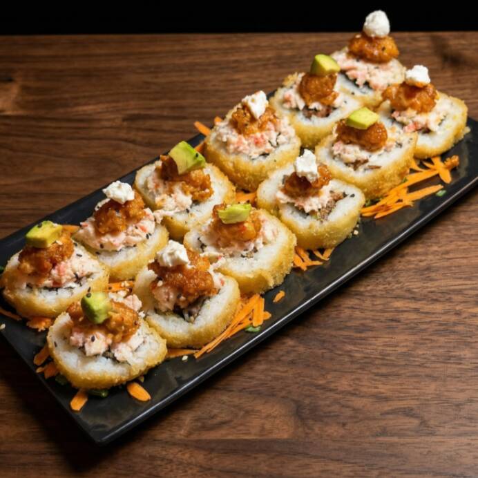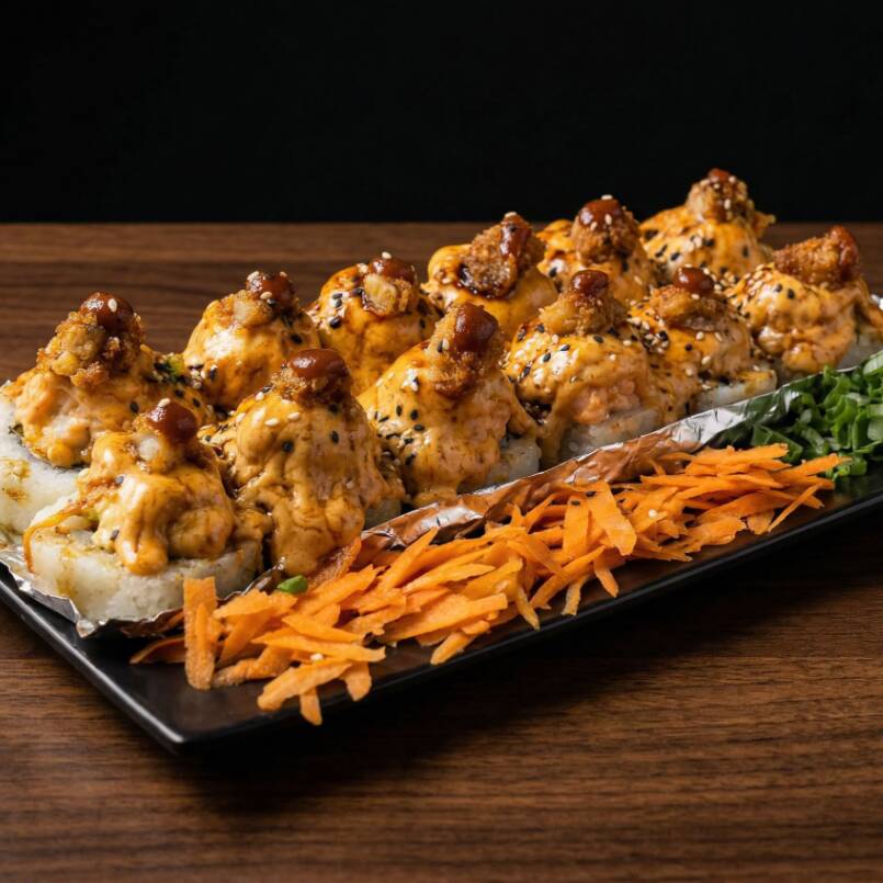 "🥩🥓🍤 Res y tocino por dentro, cubierto con una mezcla de camarón empanizado en aderezo spicy, cebolla morada, queso Philadelphia y salsa de anguila. 🍥🥑 Coronado con tampico, aguacate y puntos de sriracha. 👉 Intenso, crujiente y lleno de capas de sabor."