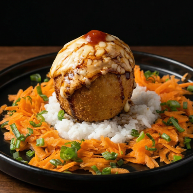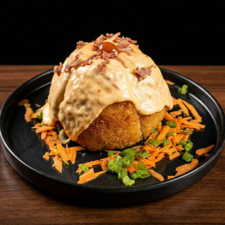 🍗🥩🦐🥓🧀 Bomba de arroz con res, pollo, tocino, queso phila, tampico y empanizada, por fuera gratinada con tocino y un punto de sriracha.