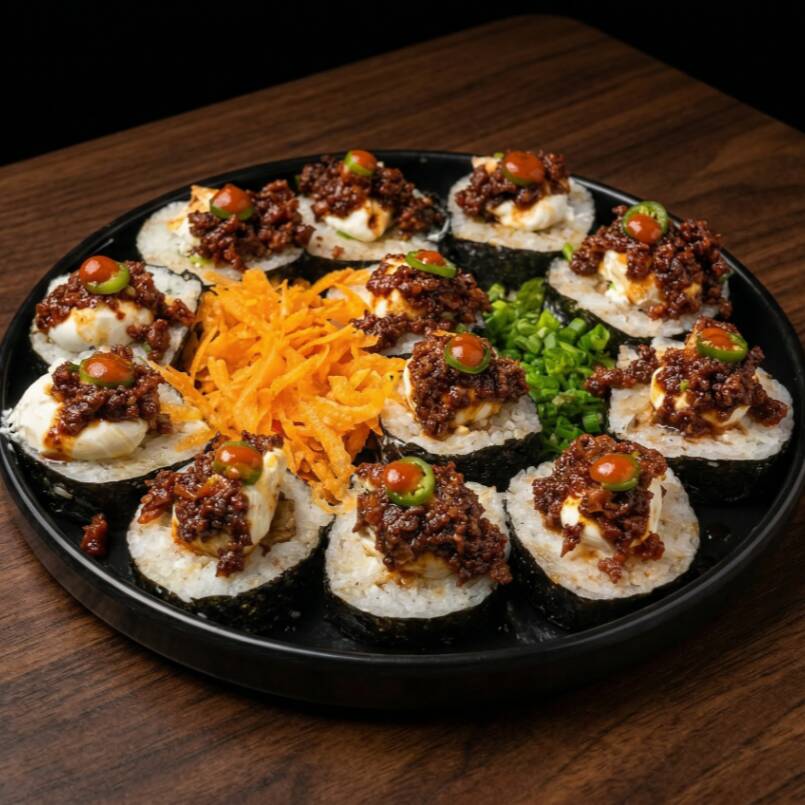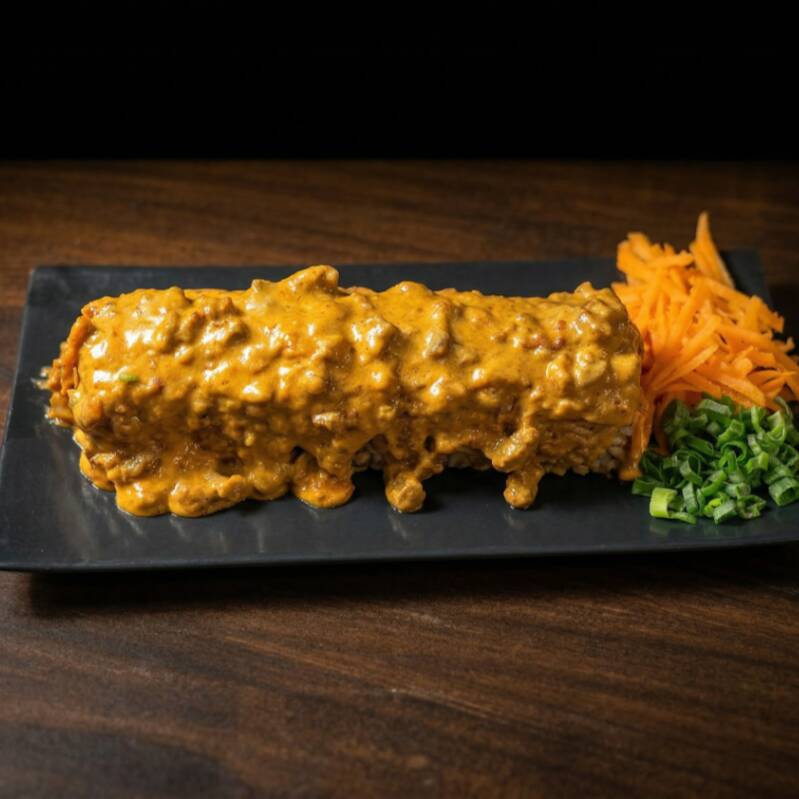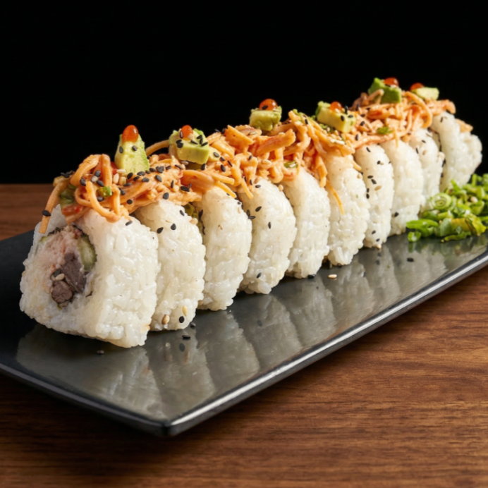 🥩🍥🦀 Relleno poderoso de tampico con res, cubierto con kanikama en aderezo spicy, cubos de aguacate y un toque de sriracha. 👉 Intenso, cremoso y con actitud.