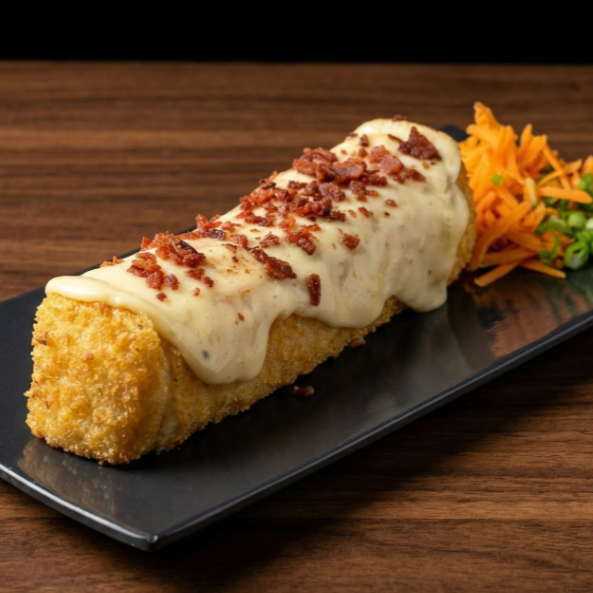 🍗🧀 Rollo de tocino con topping de pollo empanizado con BBQ y queso gratinado. 👉 Dulzón, crunchy y lleno de sabor.