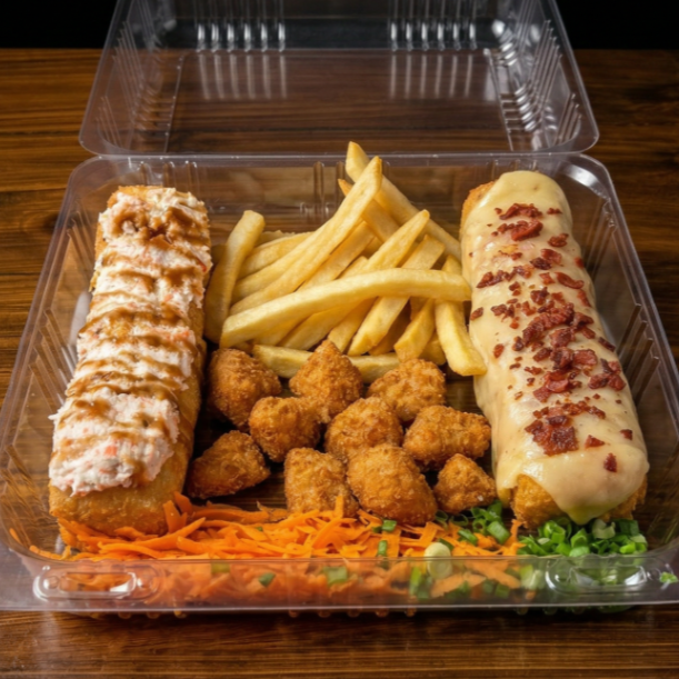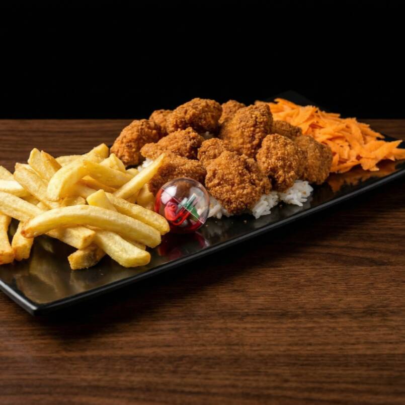 Combo para los peques: porción de papas fritas, boneless empanizados sobre cama de arroz, zanahoria rallada fresca y un juguete sorpresa. ¡Sabor y diversión en un solo plato!