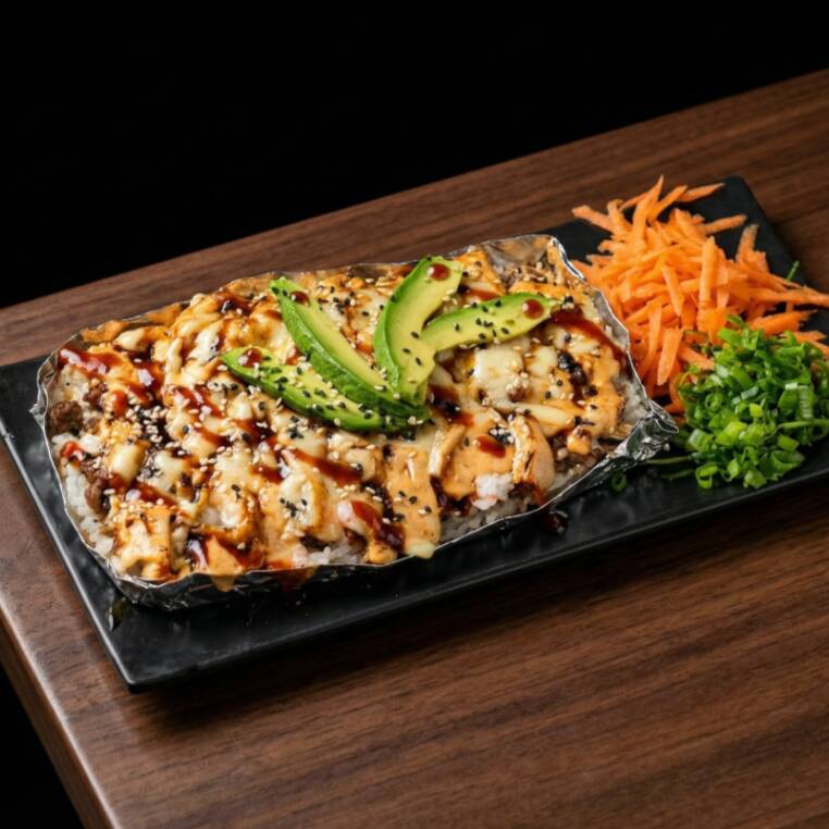 🍚🍗🥩🥓 Cama de arroz con res, pollo, tocino, queso Philadelphia y tampico, todo bañado en aderezo spicy y queso Chihuahua. 🍥🧀 Horneado al punto perfecto y terminado con salsa de anguila, ajonjolí y rebanadas de aguacate. 👉 Cremosito y brutal