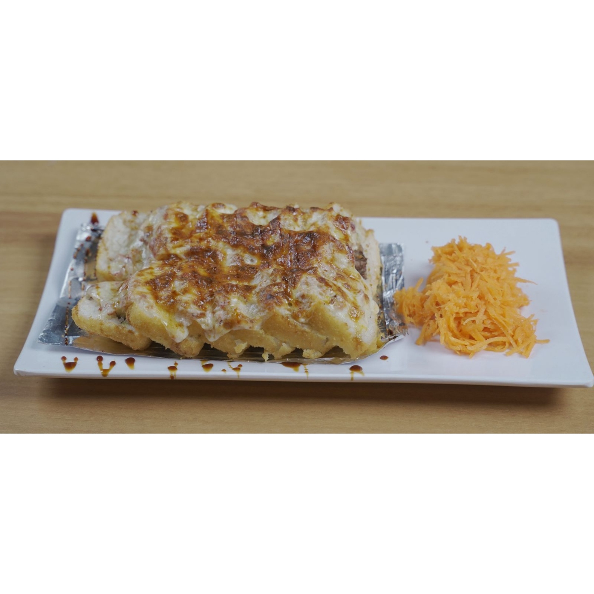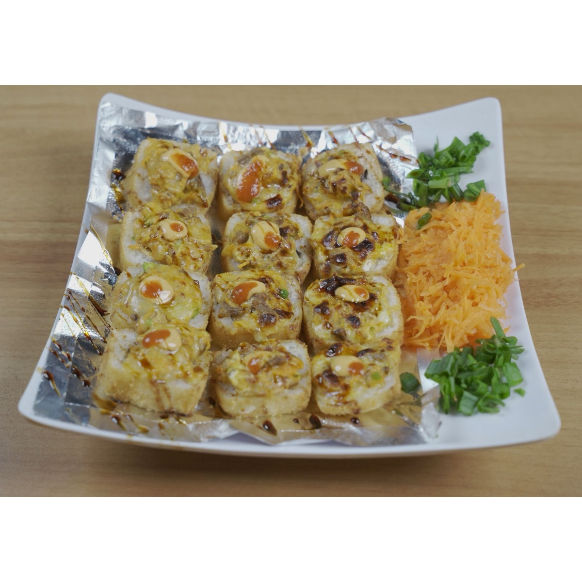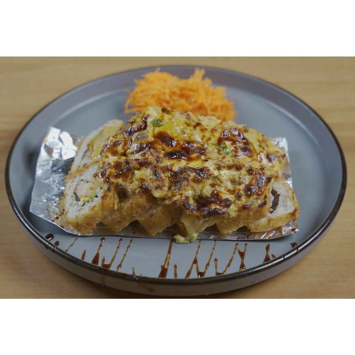 (HORNEADO) Por dentro res, camarón, tocino, aguacate, pepino, philadelphia; por fuera queso, queso philadelphia, pollo empanizado, res, serrano, zanahoria y salsa de la casa.