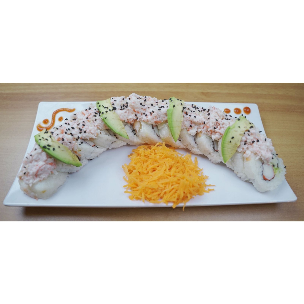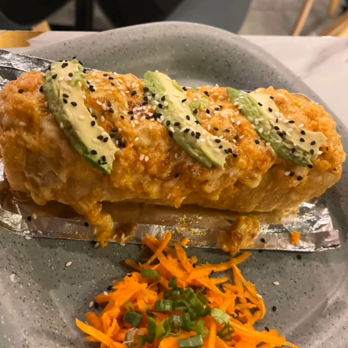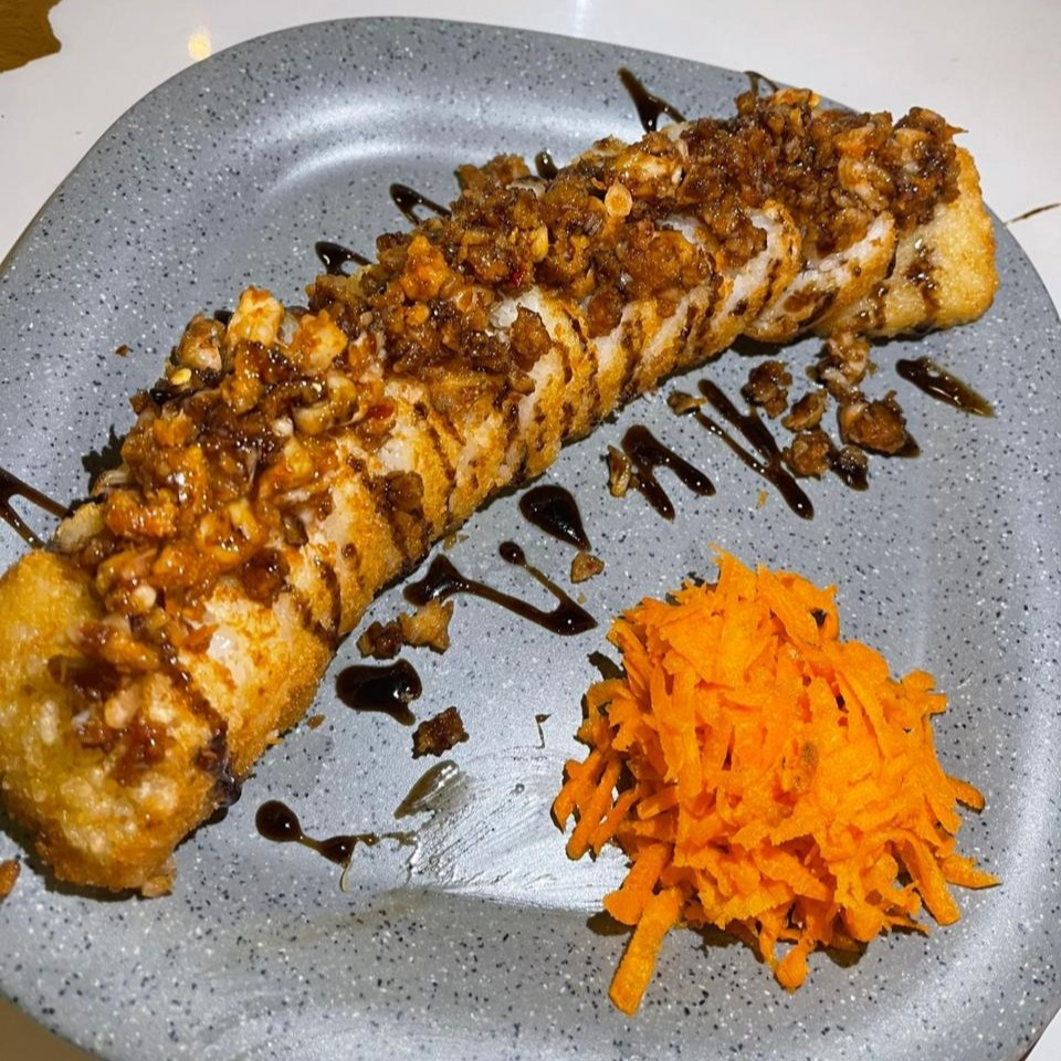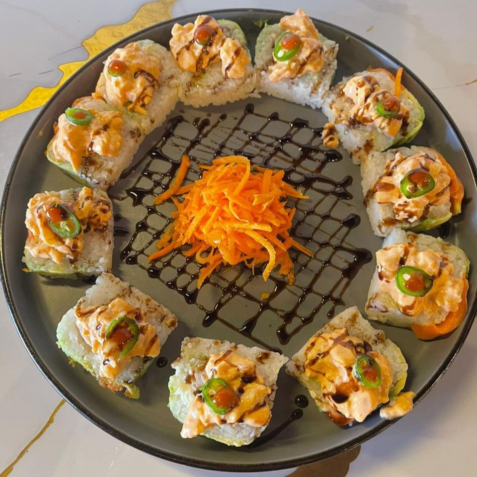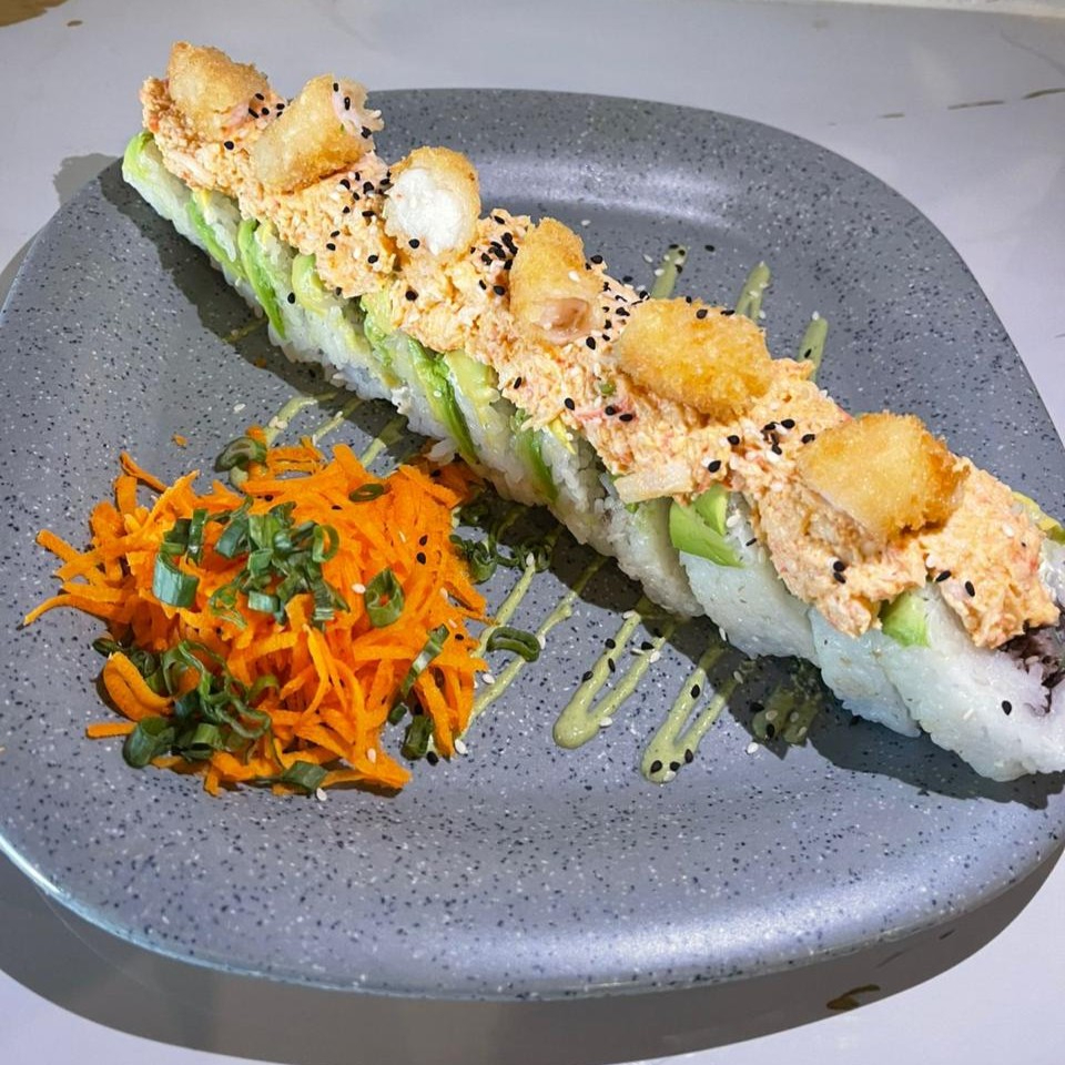 Por dentro camarón y surimi empanizado, pepino, aguacate, philadelphia; por fuera forrado de aguacate, surimi frito, bañado con aderezo y anguila, coronado con ajonjolí.