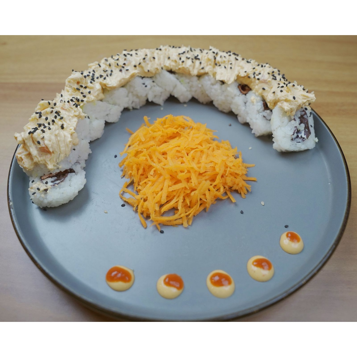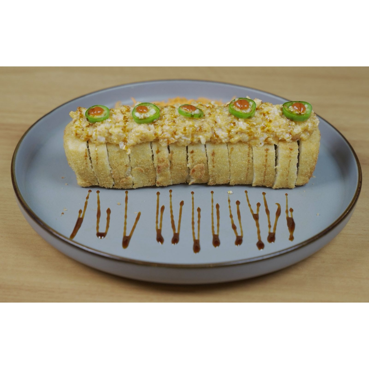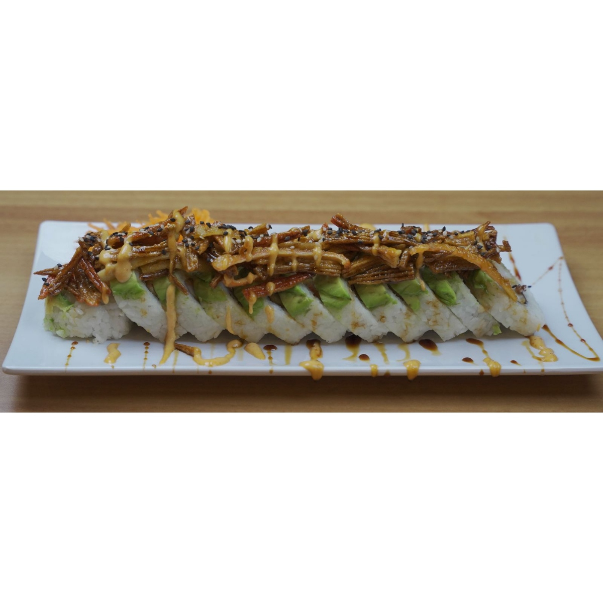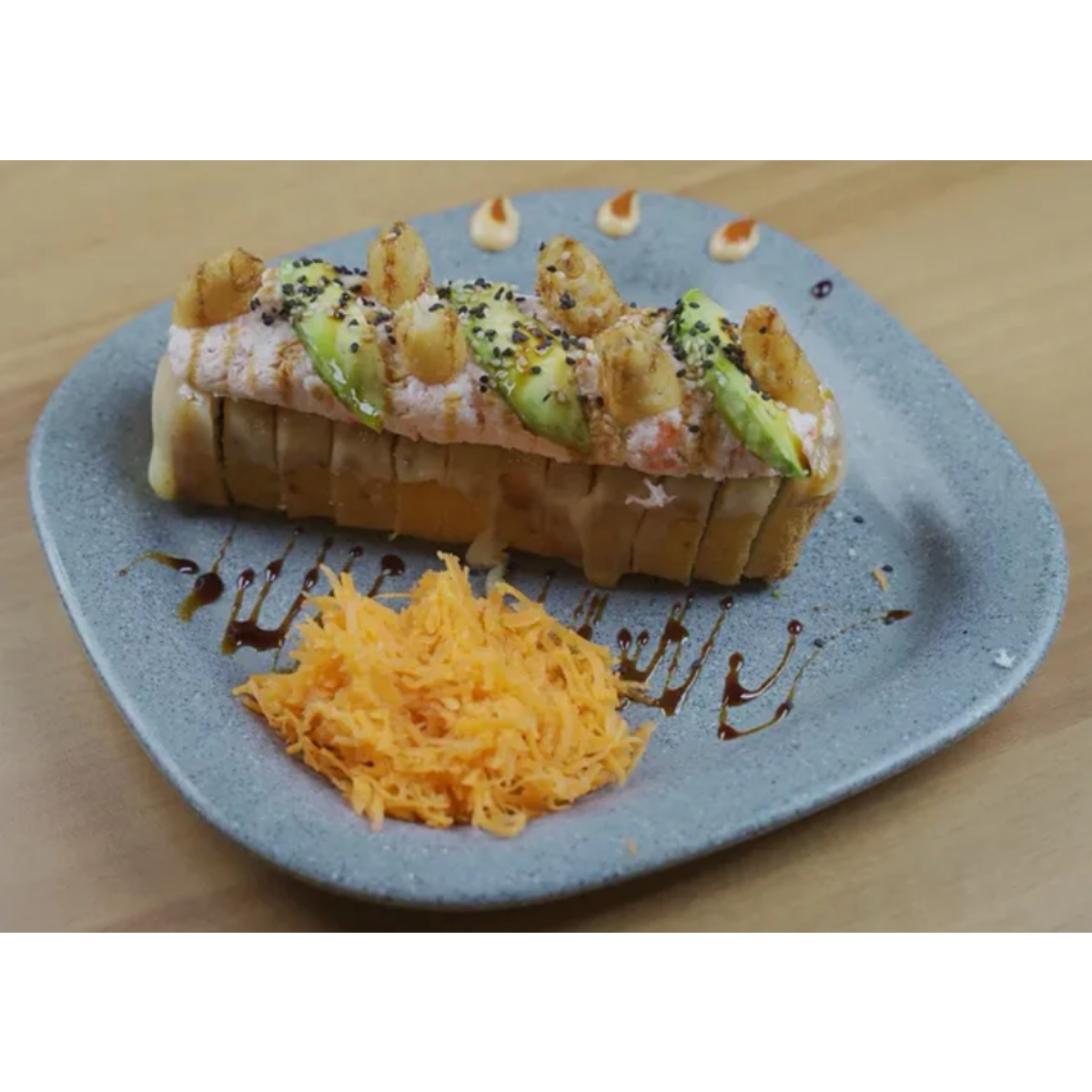 Por dentro camarón y surimi empanizado, pepino, aguacate, philadelphia; por fuera forrado de aguacate, surimi frito, bañado con aderezo y anguila, coronado con ajonjolí.