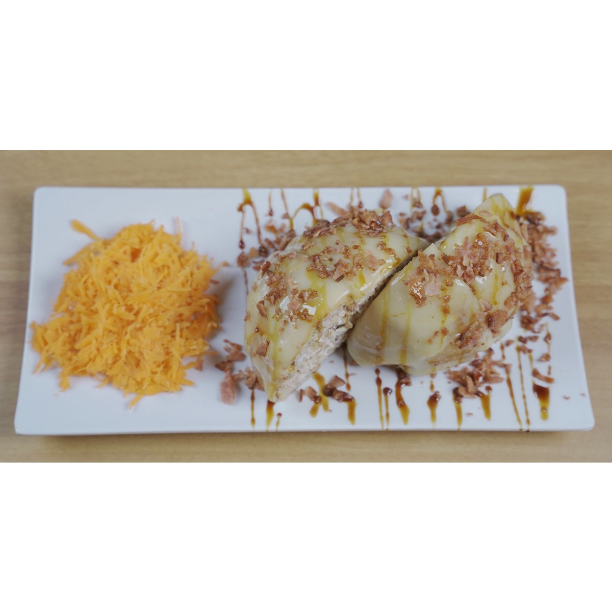 (HORNEADO) Por dentro res, pollo, aguacate, pepino, philadelphia; por fuera tocino, queso y queso philadelphia.