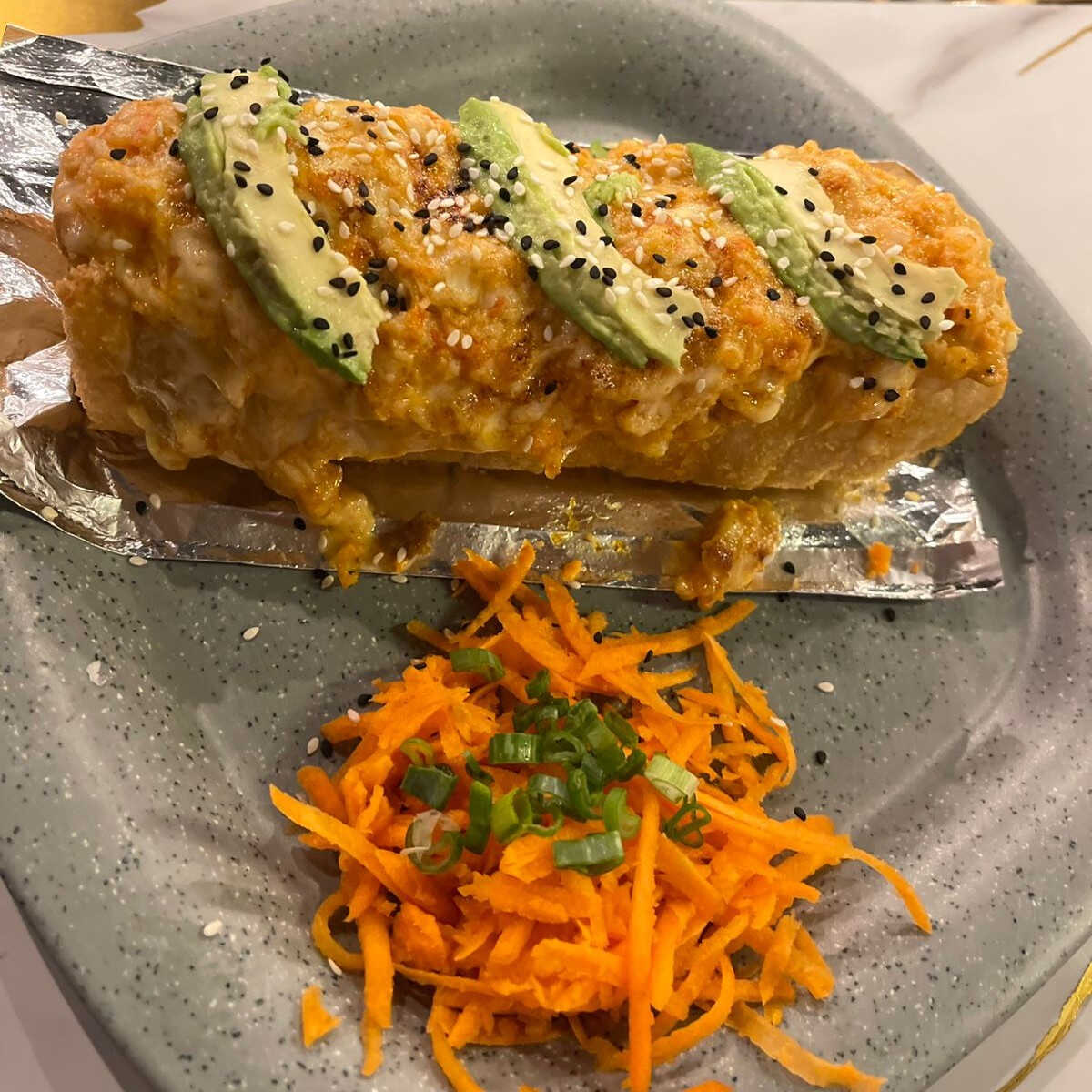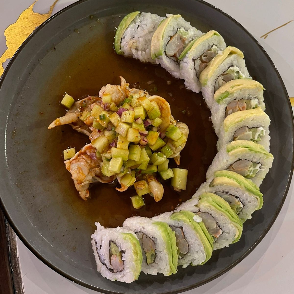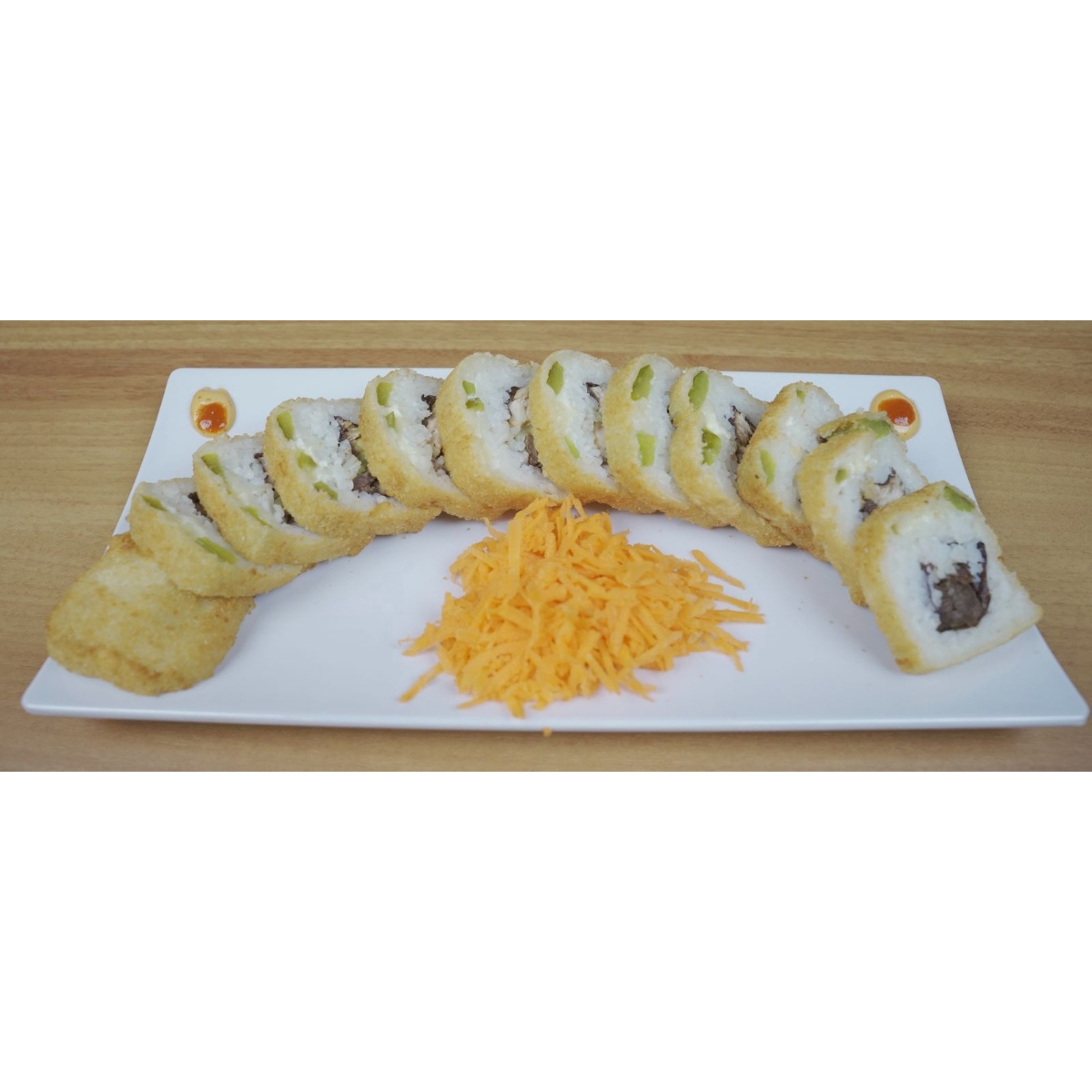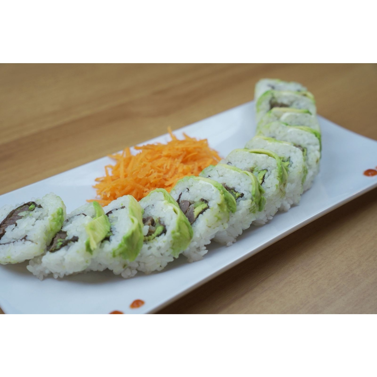 Por dentro res, pepino, aguacate, philadelphia; por fuera forrado de aguacate, tampico spicy y camarones empanizados.