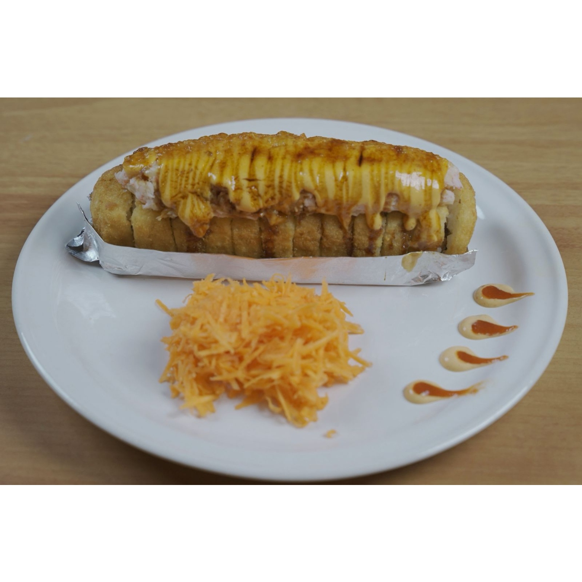 Por dentro pollo, tocino, aguacate, pepino, philadelphia; por fuera gratinado especial, con topping de camarón empanizado, bañado en spicey dulce.