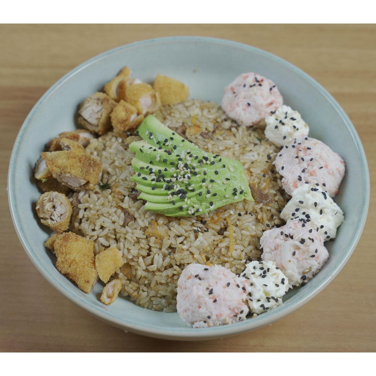Arroz, res, pollo, camarón, decorado con aguacate, tampico y philadelphia.