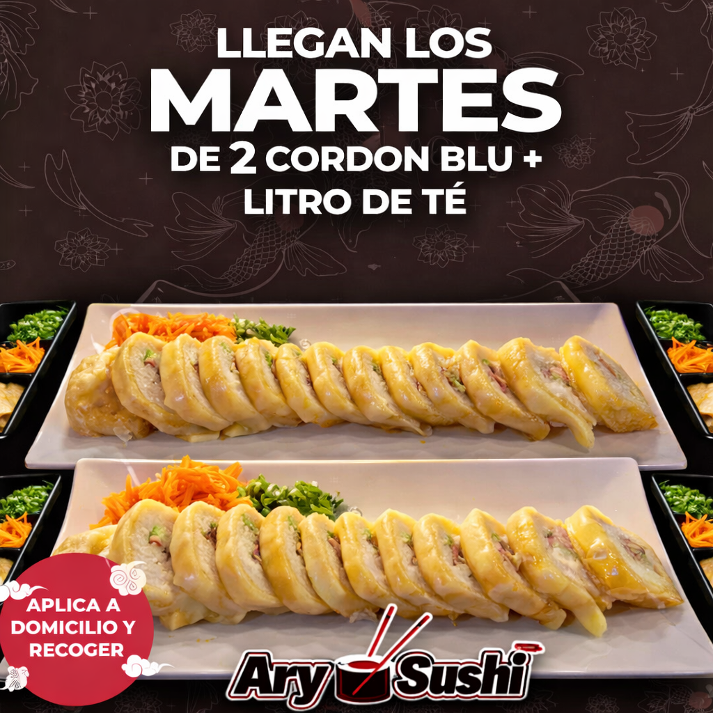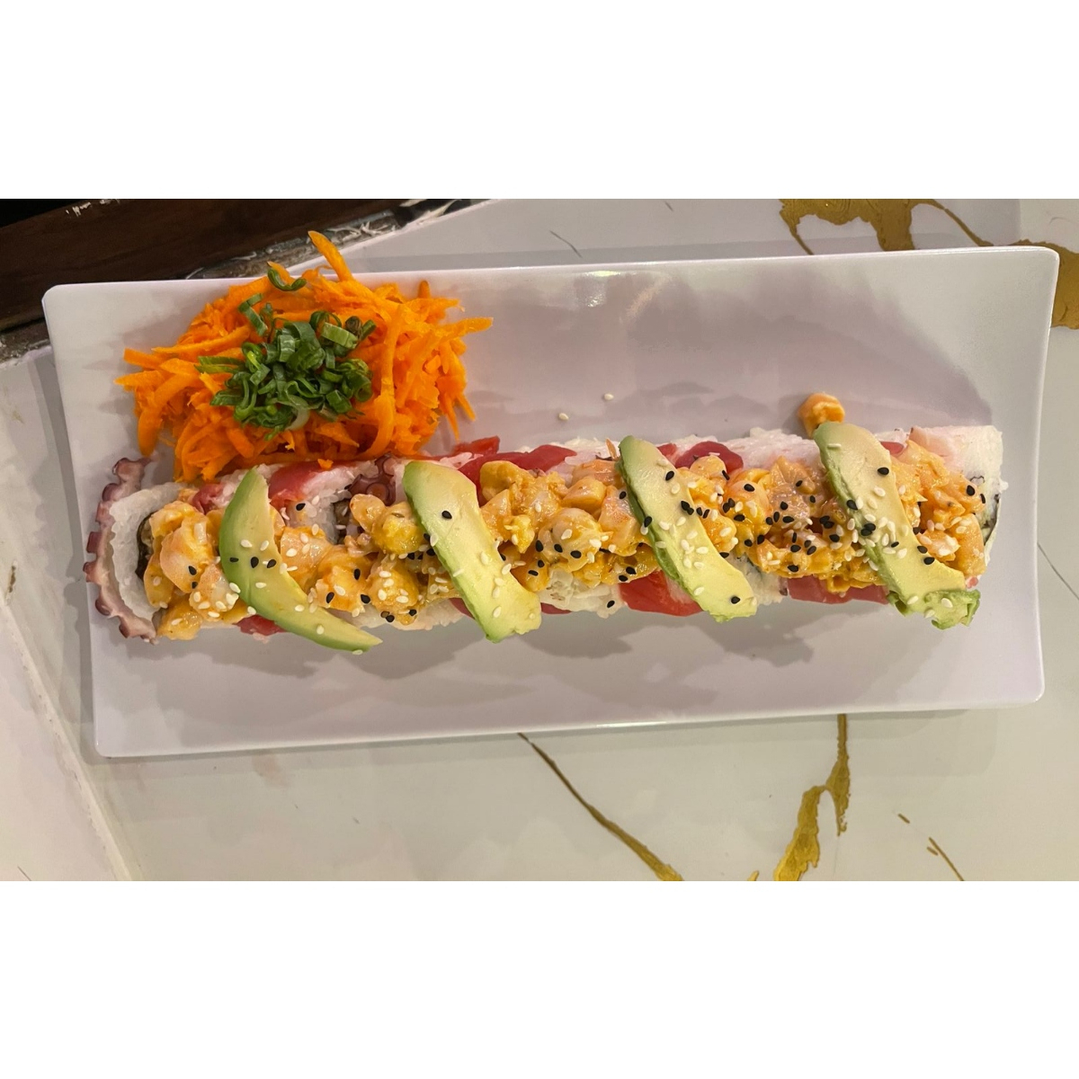 Por dentro surimi empanizado, aguacate, pepino, phila; por fuera forrado de atún, pulpo, camarón spicy, coronado con aguacate, anguila y ajonjolí.