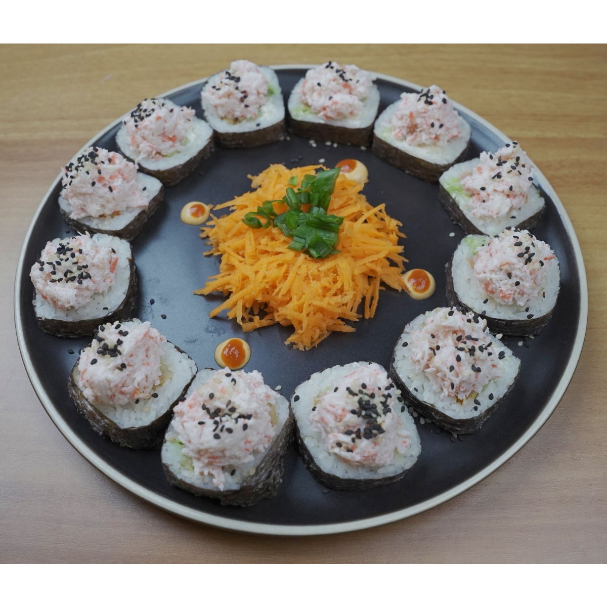 Por dentro zanahoria, pepino, aguacate, philadelphia; por fuera forrado en ajonjolí.