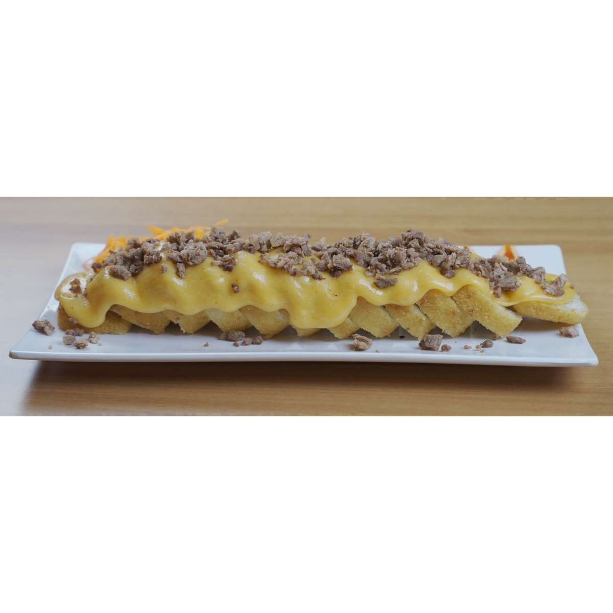 Por dentro res, tocino, pepino, aguacate, phila; por fuera queso gratinado con salsa de la casa y res frita.