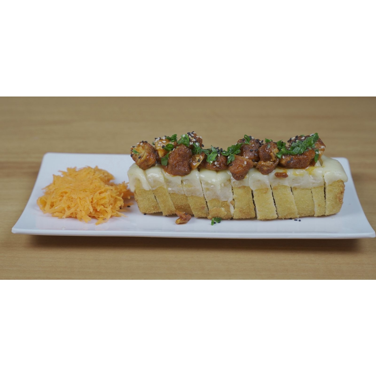 Tostada de wuonton de arroz con una capa de aderezo chipotle, lámina de aguacate, con cubos de atún marinados en soya y aceite de oliva, decorada con frituras de kanikama, bañada en salsa de anguila y ajonjolí.