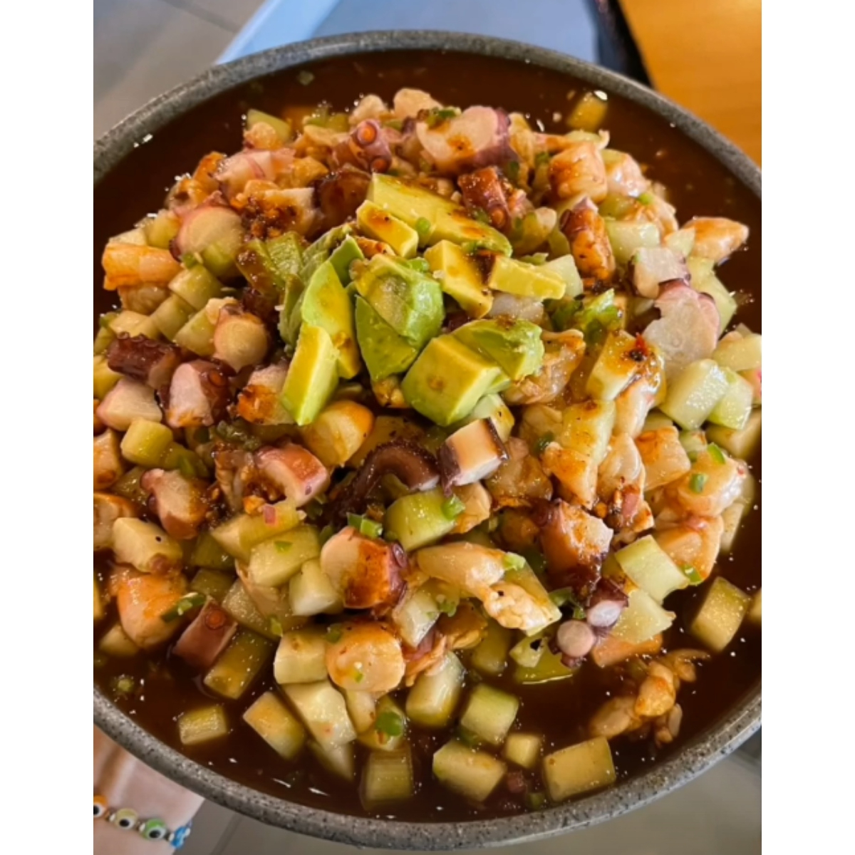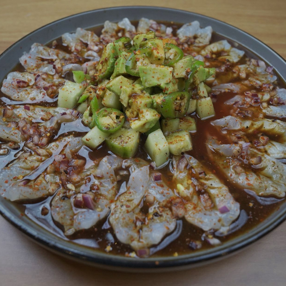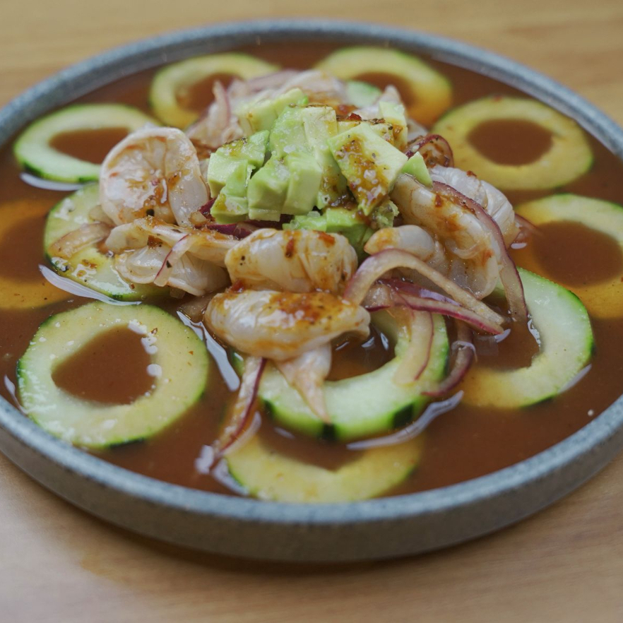 Pepino, cebolla, aguacate, camarón crudo, camarón cocido y pulpo bañado en salsas de la casa.