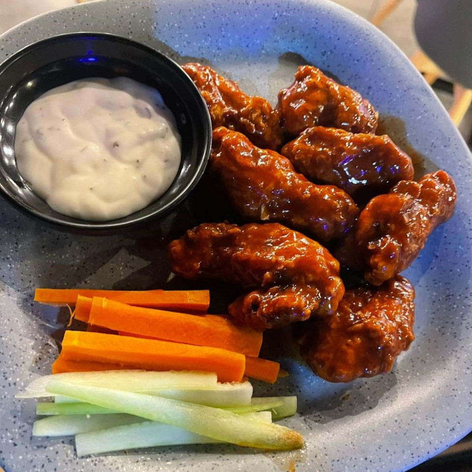 Alitas de sabor a elegir: BBQ, Búfalo, Mango Habanero y Hot BBQ.