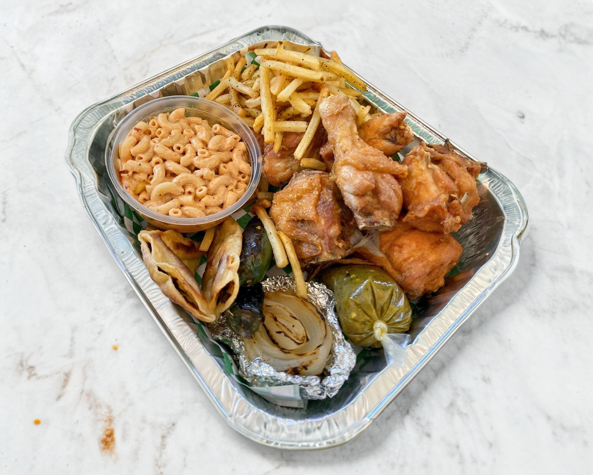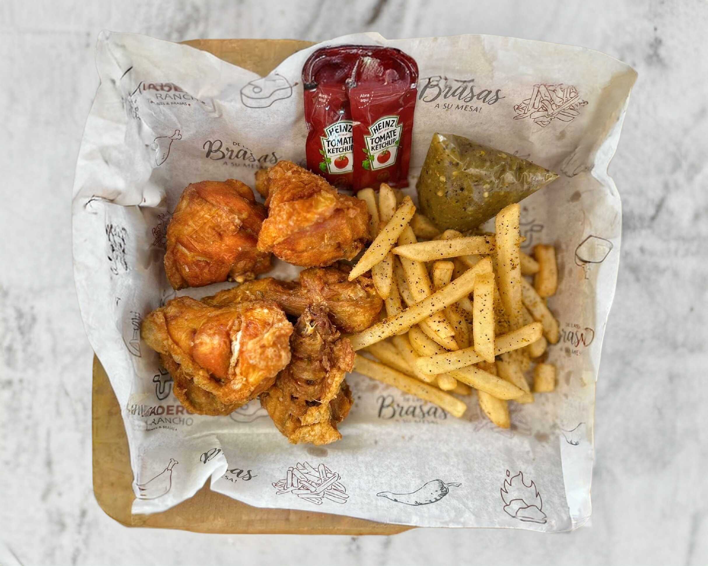 1 pollo frito entero + papas a la francesa + 2 pz taquitos crunch c/ asientos + 1/4 sopa fría + cebolla y chiles asados + salsas y tortillas