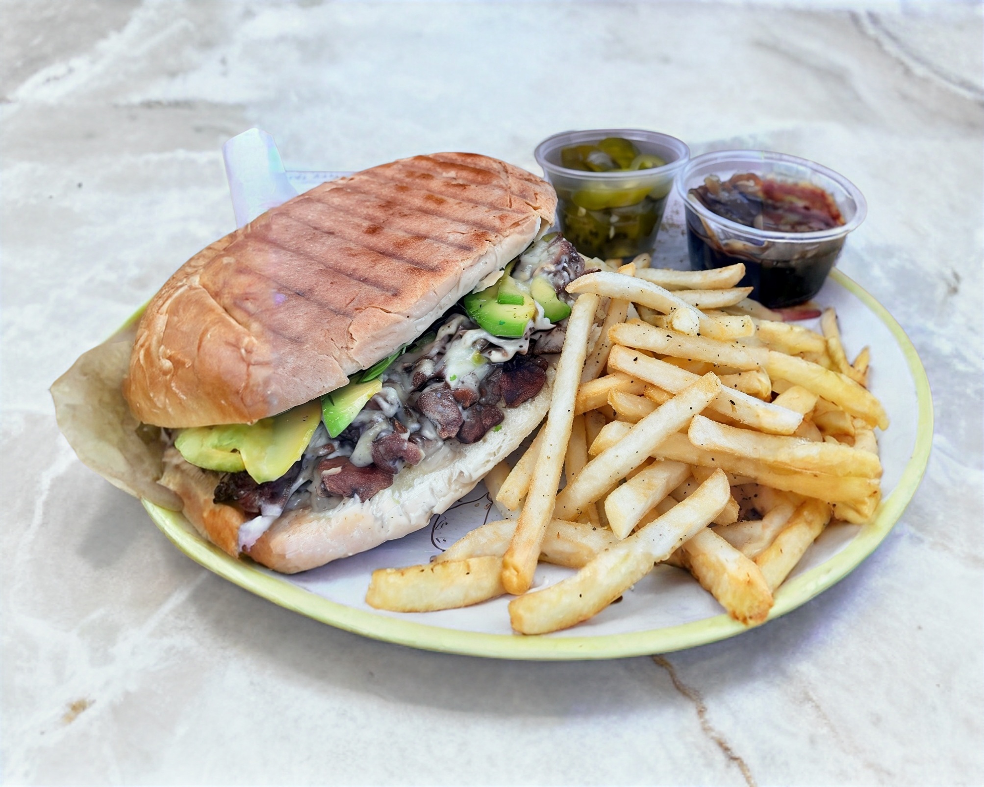 Torta con carne asada, queso gratinado y aguacate, acompañada de papas fritas, chiles y cebollita.