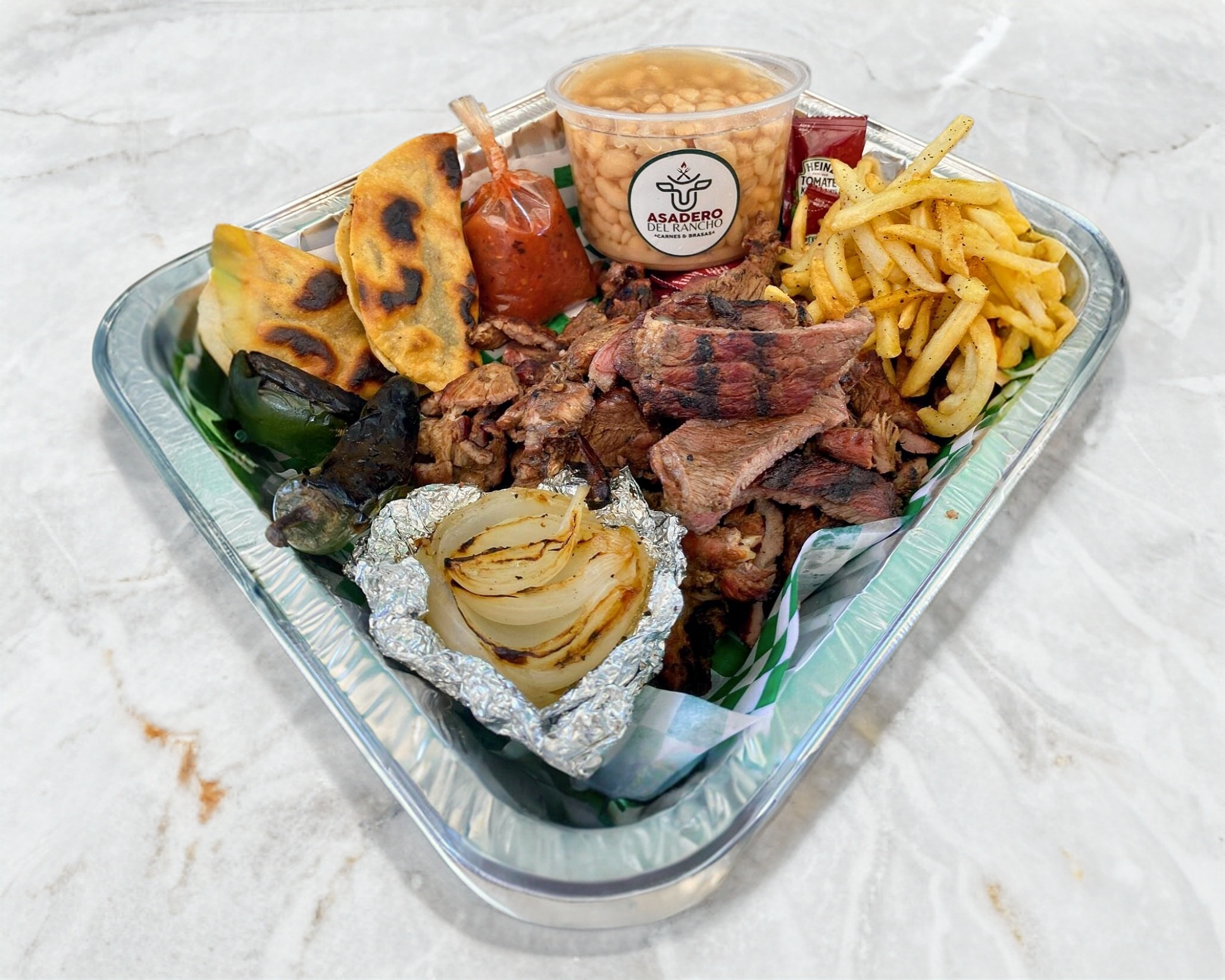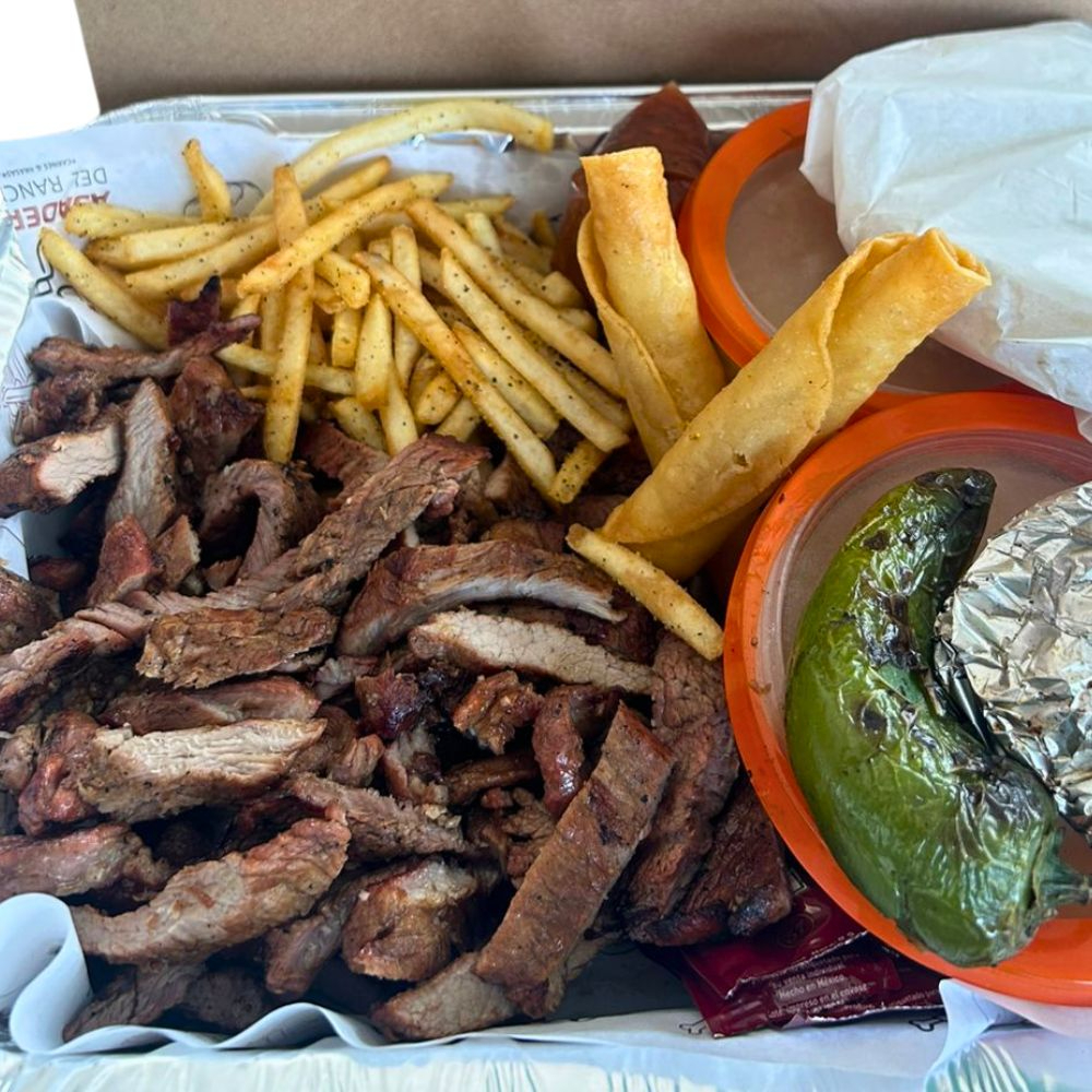 1 kg carne asada + papas a la francesa + 2 pz taquitos crunch c/ asientos + 1/2 lt frijolitos guisados + cebolla y chiles asados + salsas y tortillas