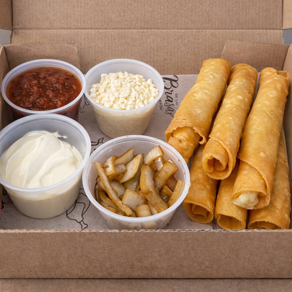 Tacos dorados de papa acompañados de queso, crema, salsa y cebollitas.
