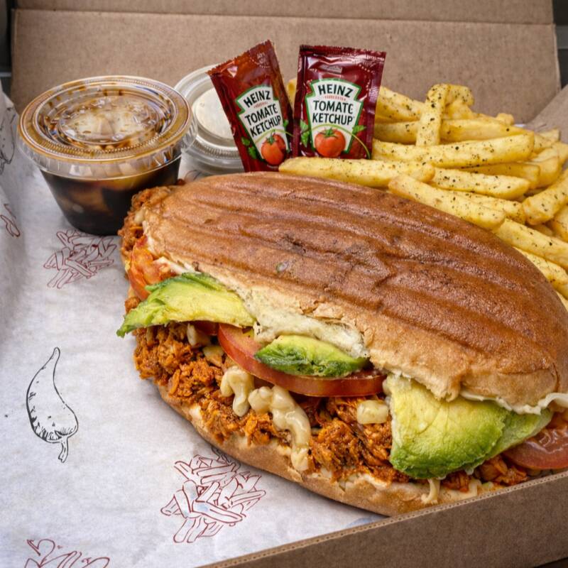 Torta de cochinita con queso, aguacate y tomate, con papas fritas, cebollitas, chiles jalapeños y catsup.