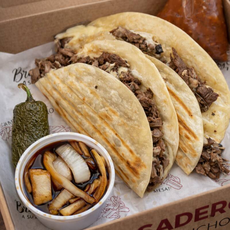 2 quesadillas de carne asada acompañadas de chile toreado, cebollitas y salsa