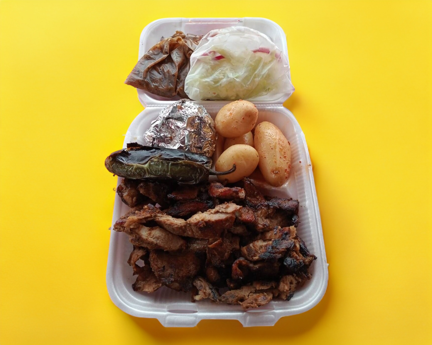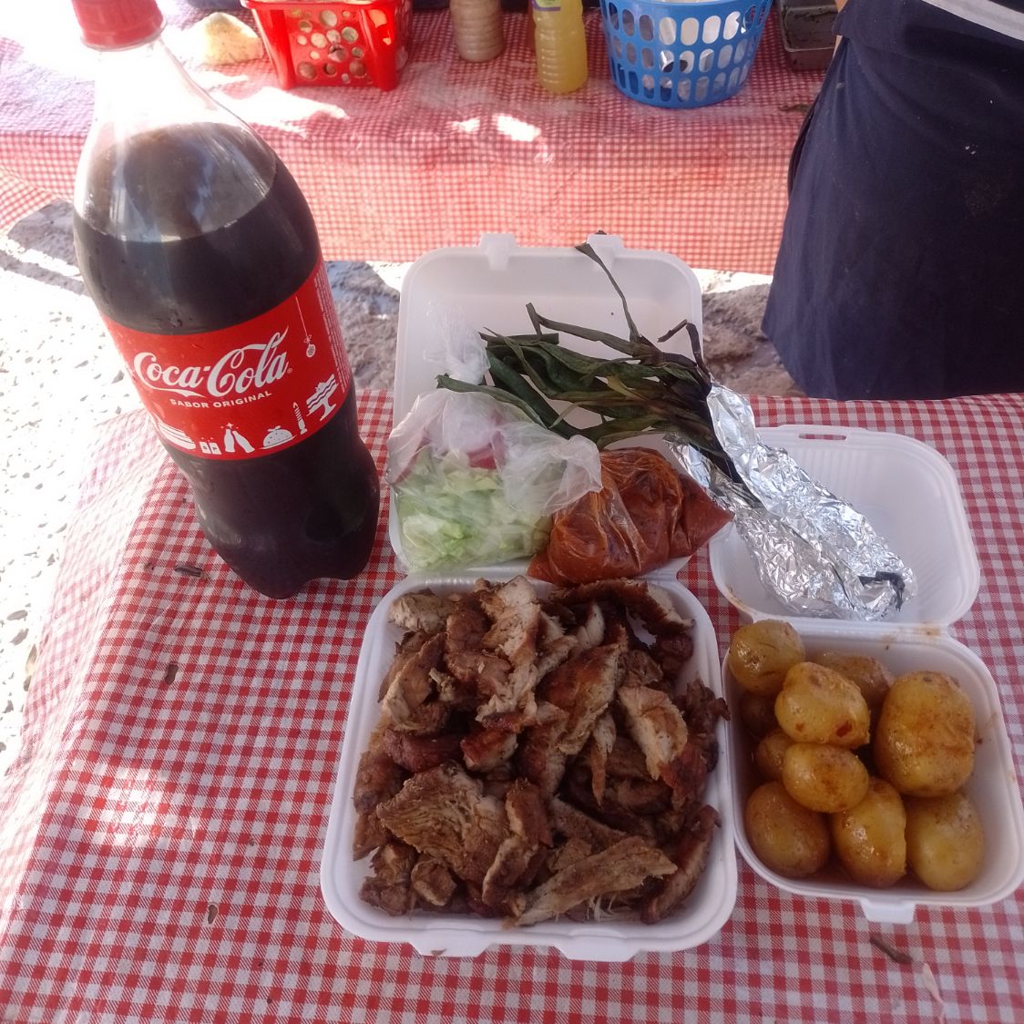 Pollo asado al carbon, papá adobada,tortillas,salsa tatemada,verdura(lechuga y rábano) cebolla asada y chiles toreados