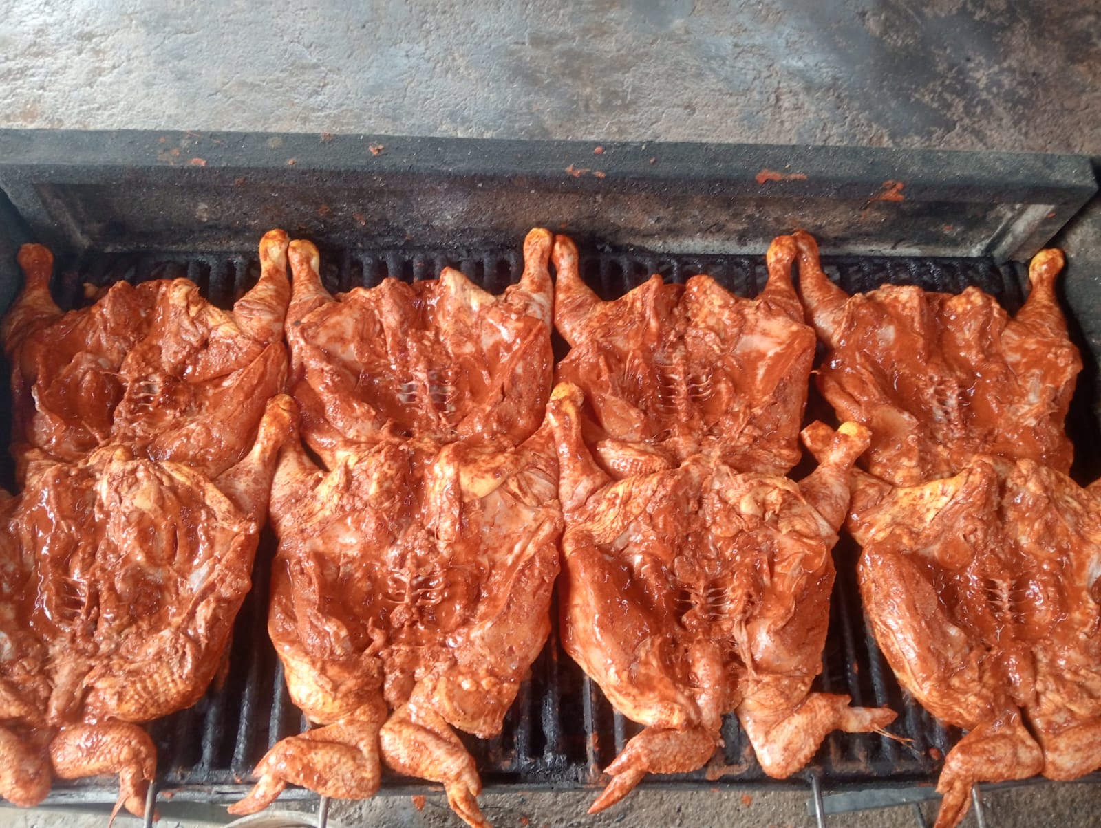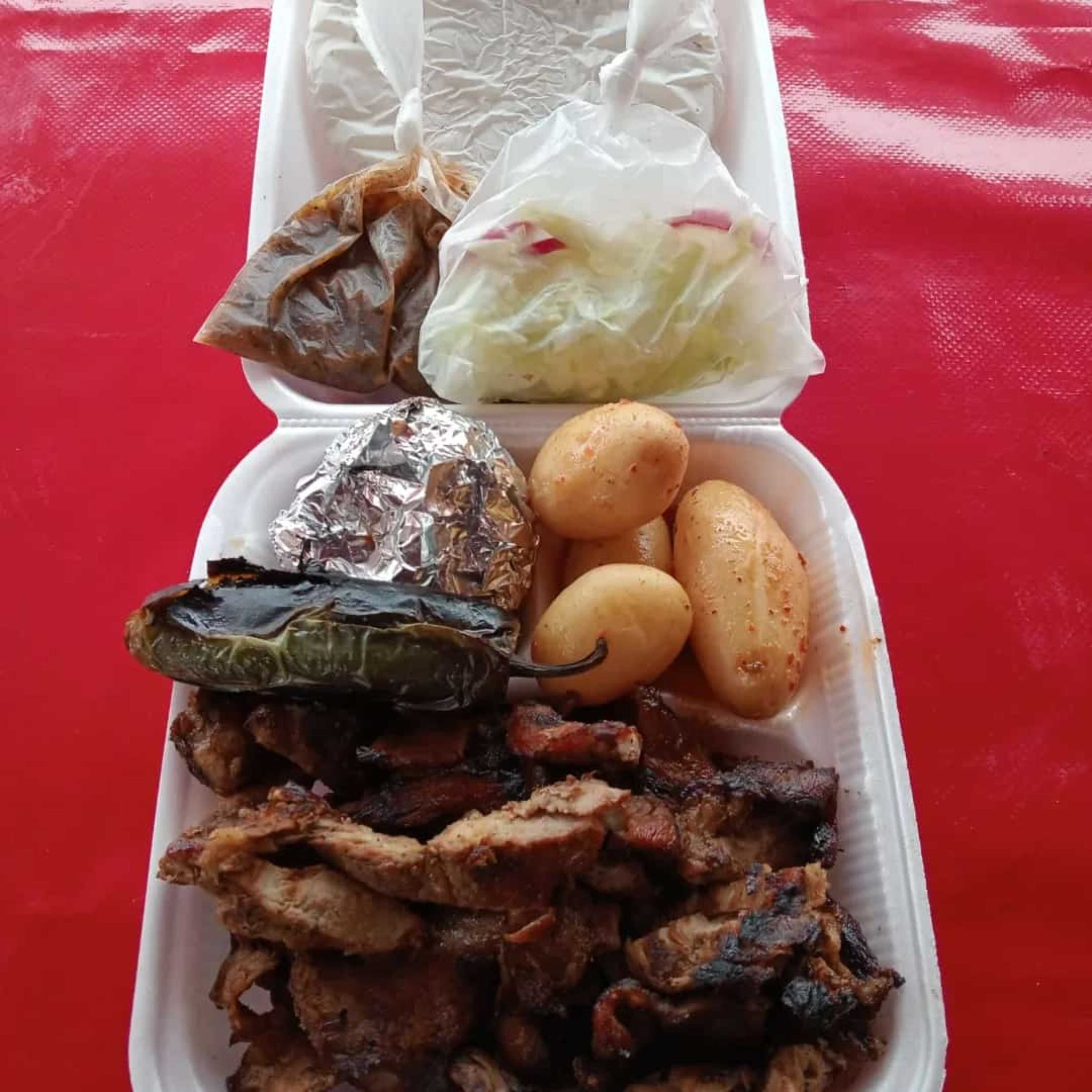 Pollo asado al carbón, papa adobada, tortillas, salsa tatemada, verdura (lechuga y rábano), cebolla asada y chiles toreados.