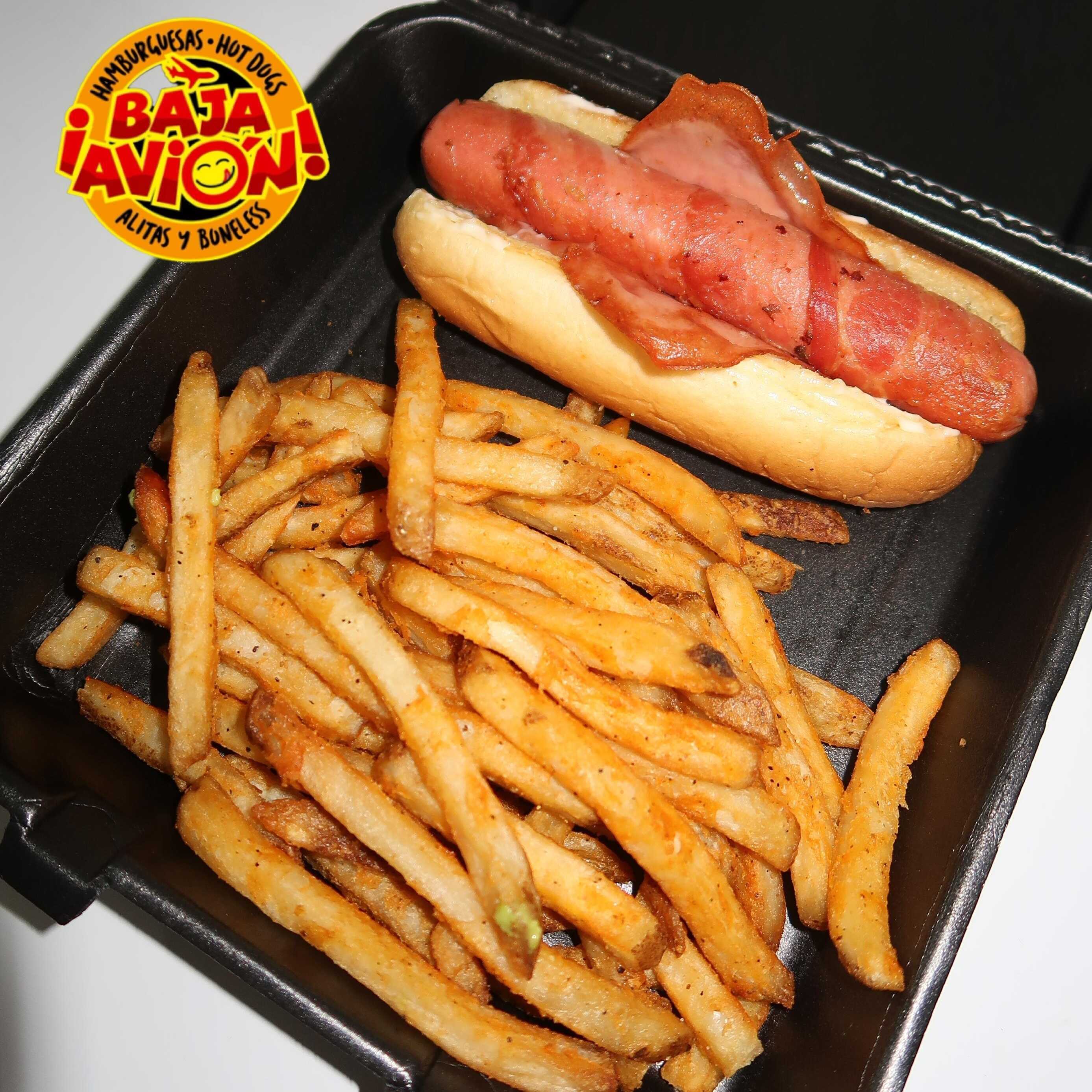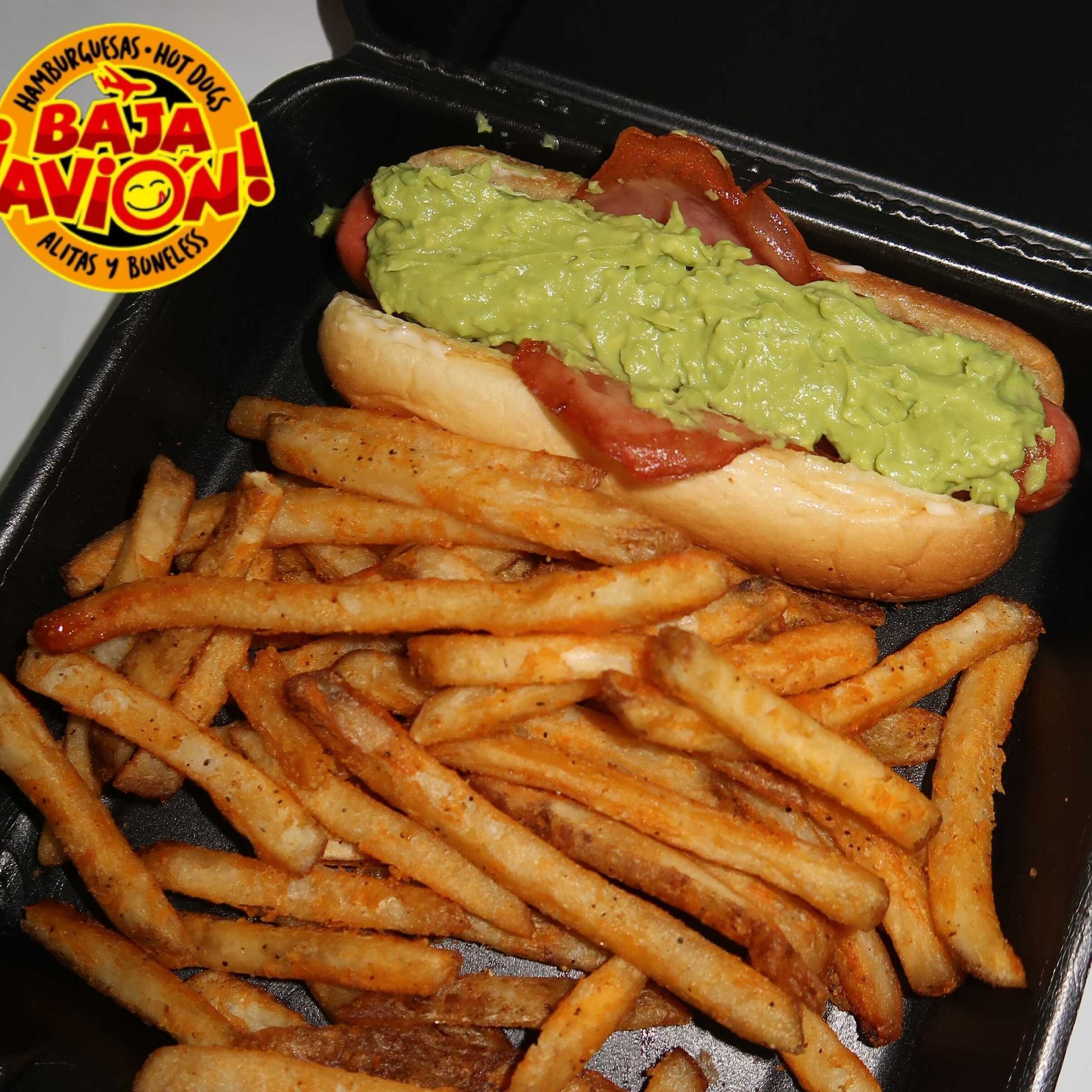 Pan para hot dogs, salchicha de pavo envuelta en tocino, Jamon, queso americano y guacamole.