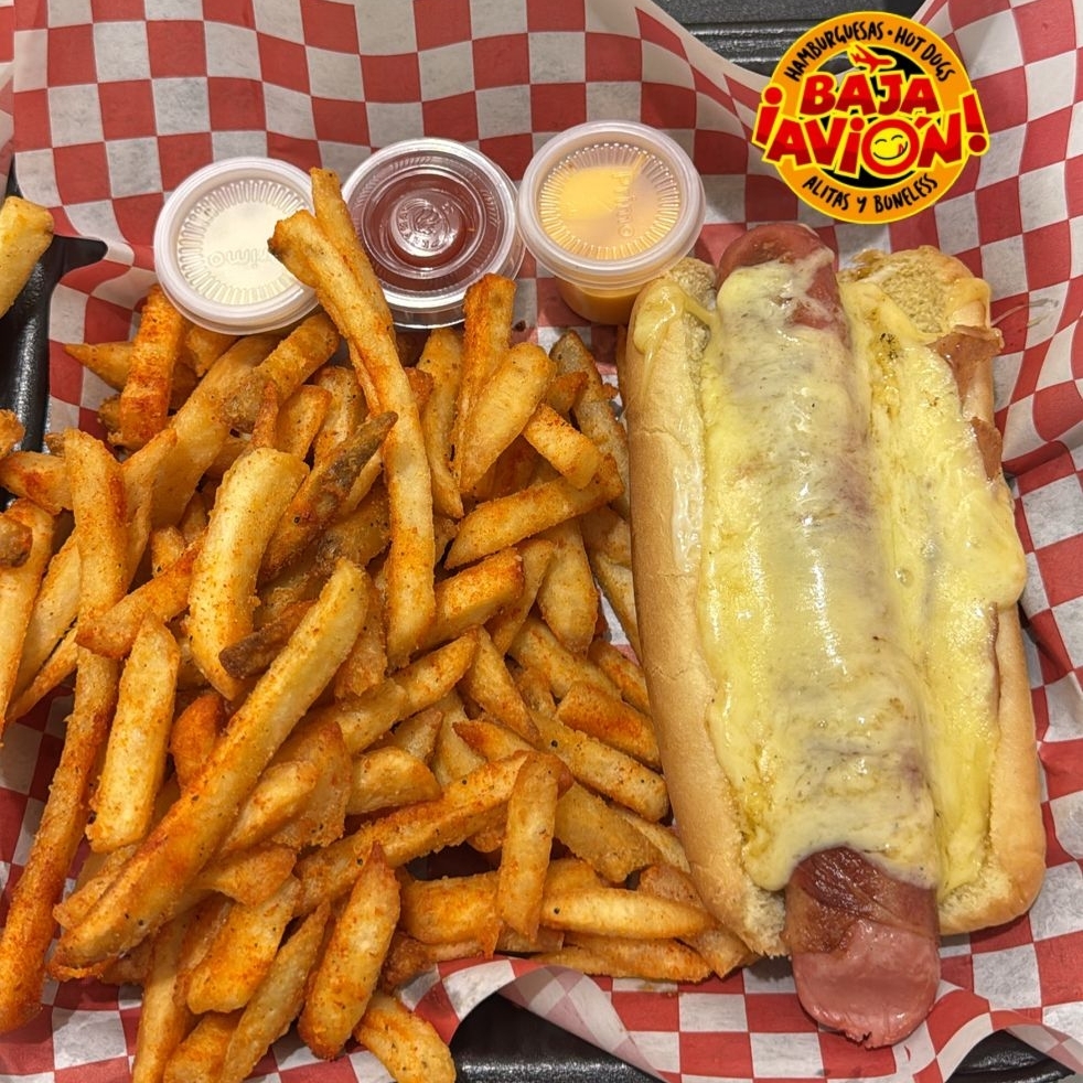 Pan para hot dog, salchicha de pavo envuelta en tocino, jamón, queso americano, queso philadelphia y queso manchego